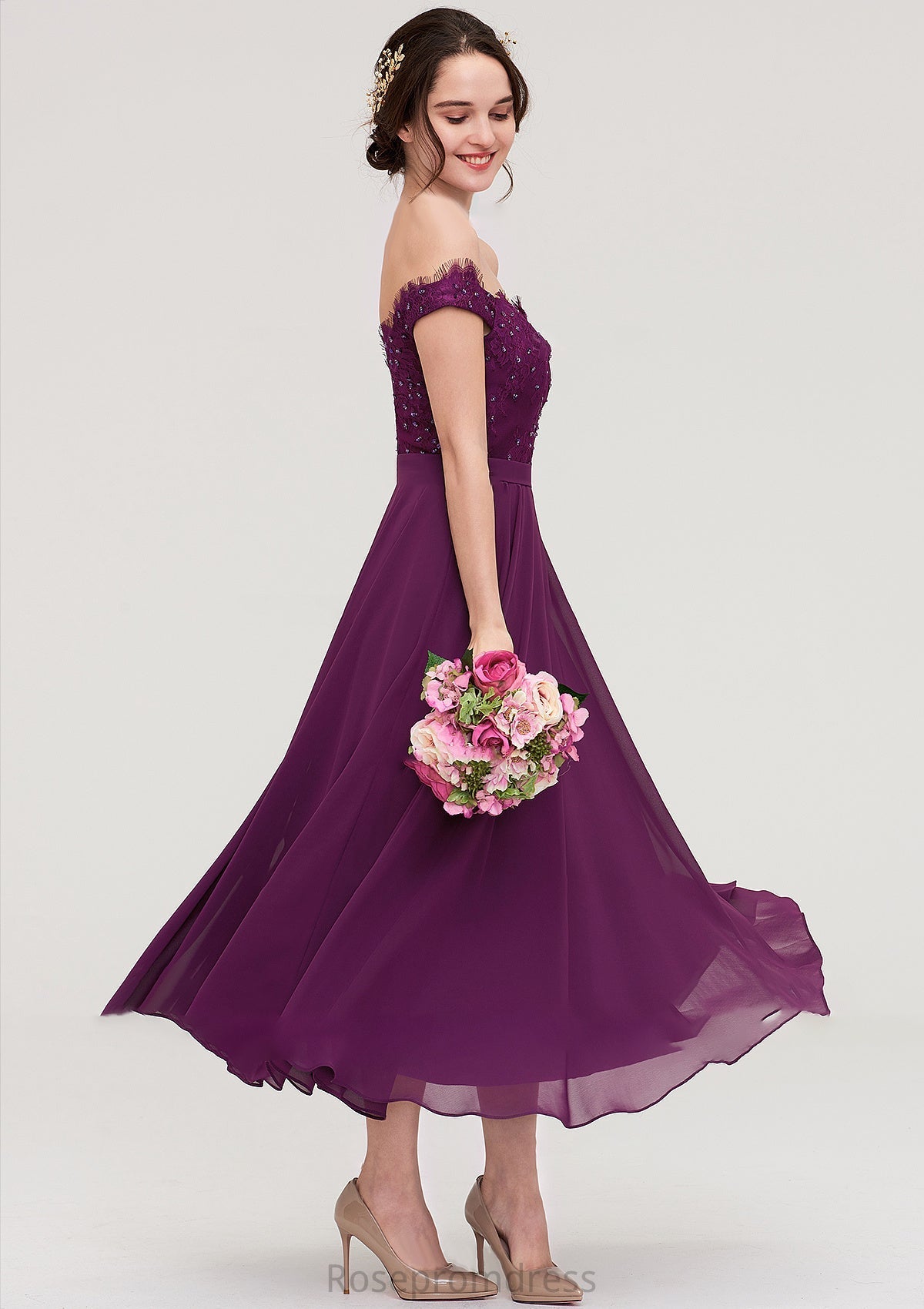 Off-the-Shoulder Sleeveless Tea-Length Chiffon A-line/Princess Bridesmaid Dresses With Lace Beading Riya SRSP0025446