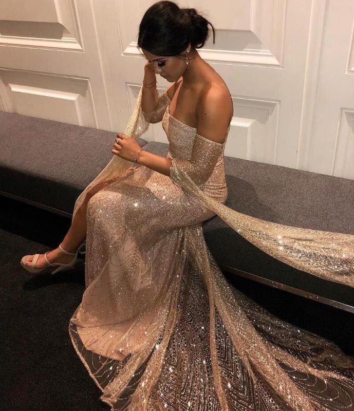 Off the Shoulder Sparkle Long Sleeves Prom Dresses Sequins Mermaid Evening SRS13107
