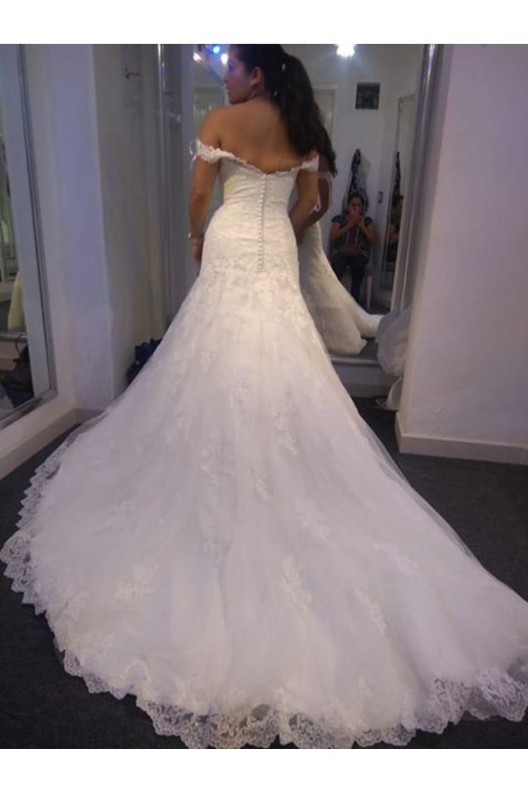 Off The Shoulder Tulle Wedding Dresses Bridal Dresses Appliques Covered Button Court Train