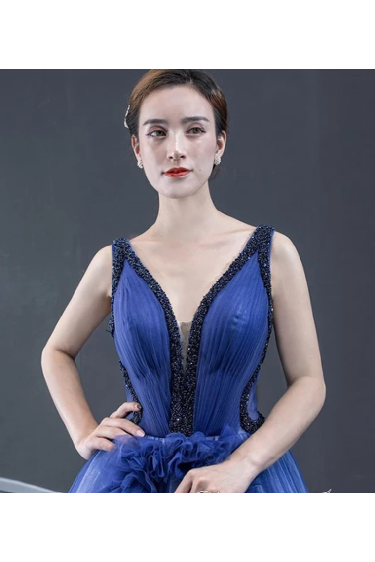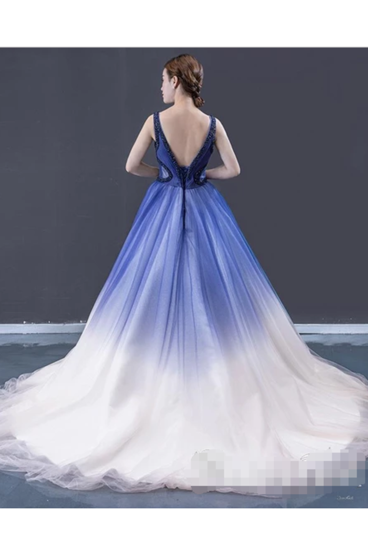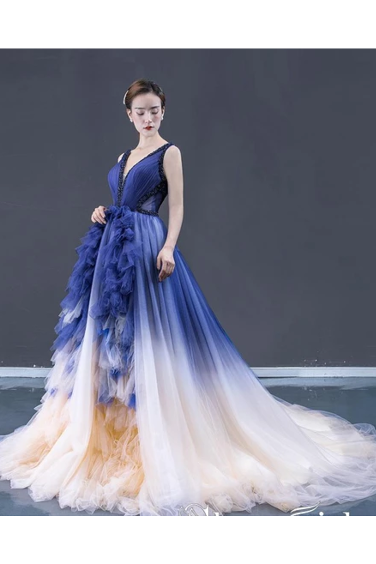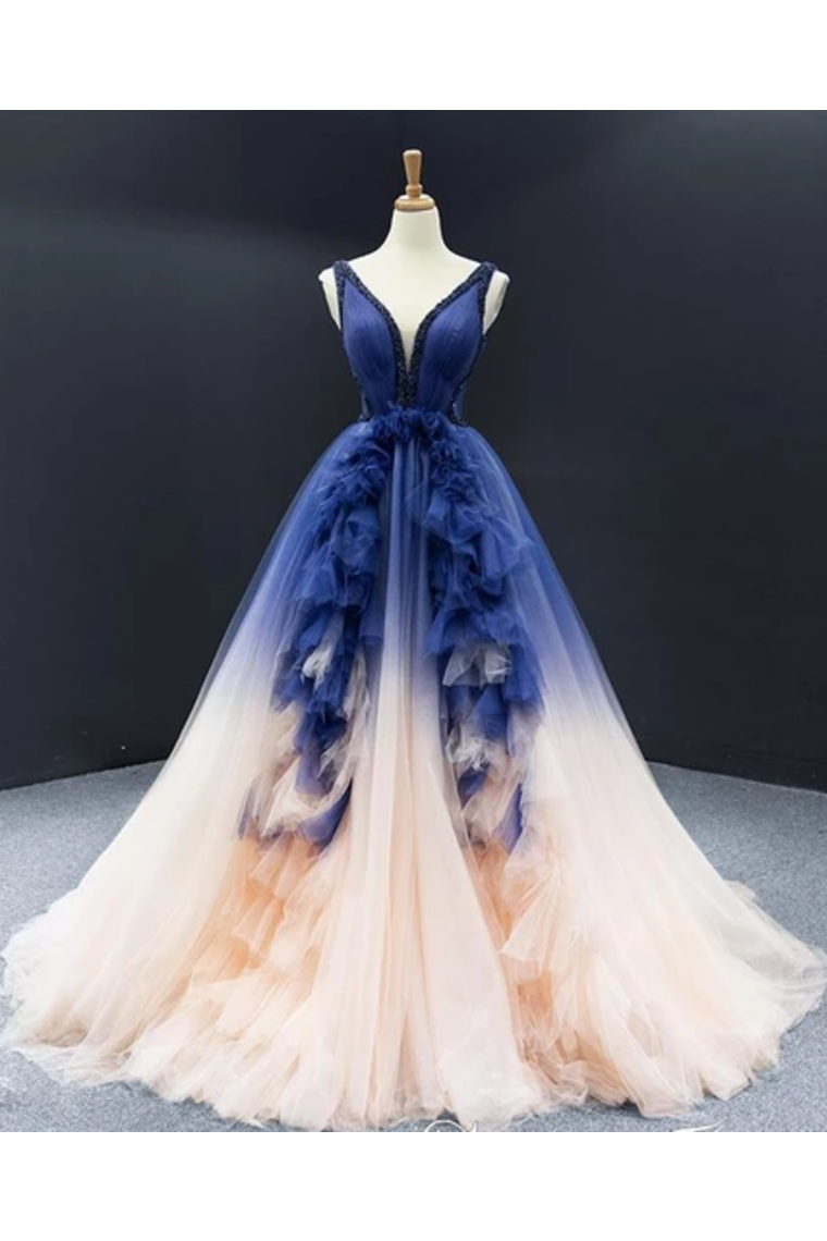 Ombre Contrast Colored A Line Prom Dress Pleated V Neck Long Formal Dress