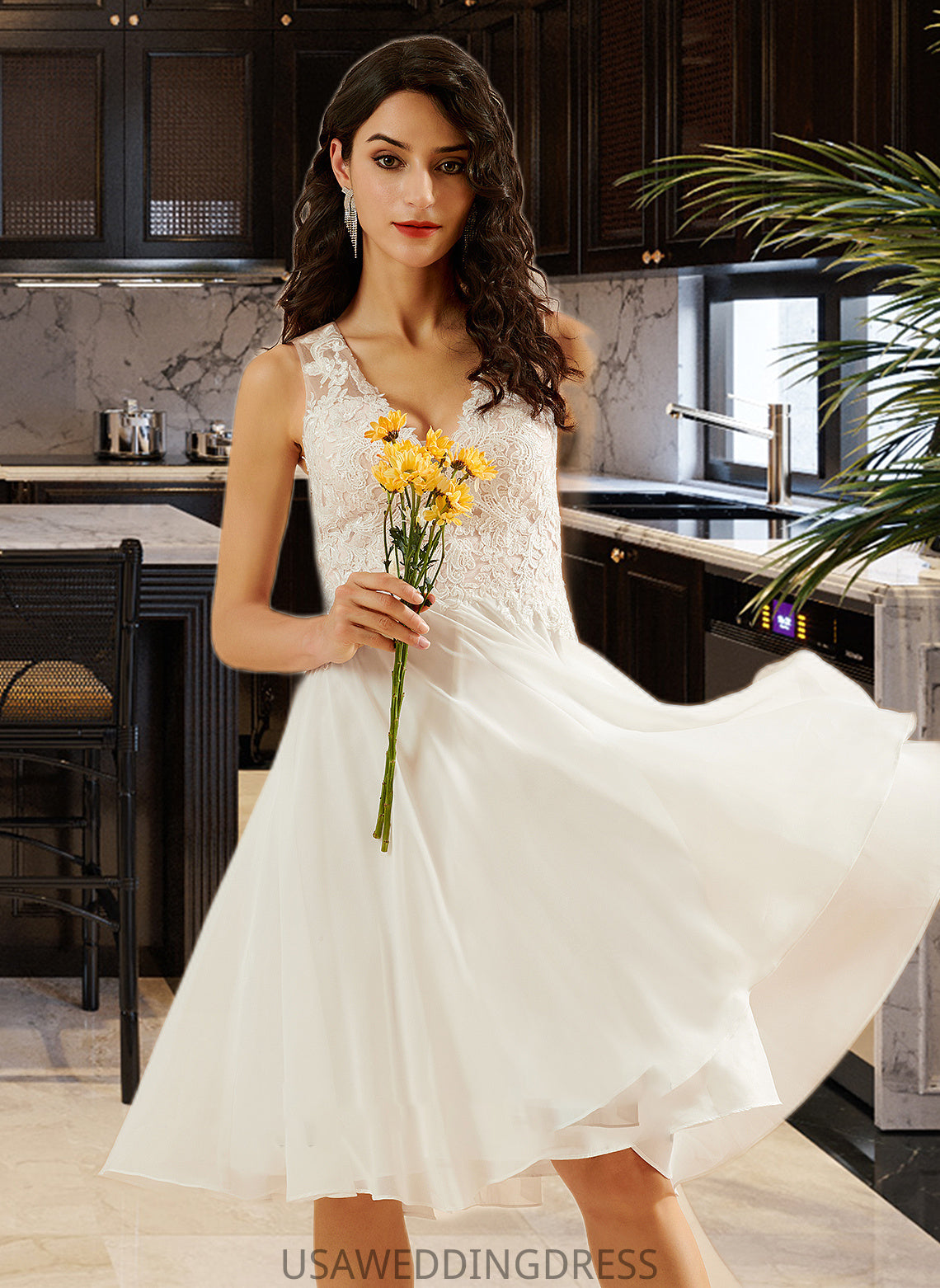 Paisley A-Line V-neck Knee-Length Wedding Dress With Lace Sequins DSP0013703