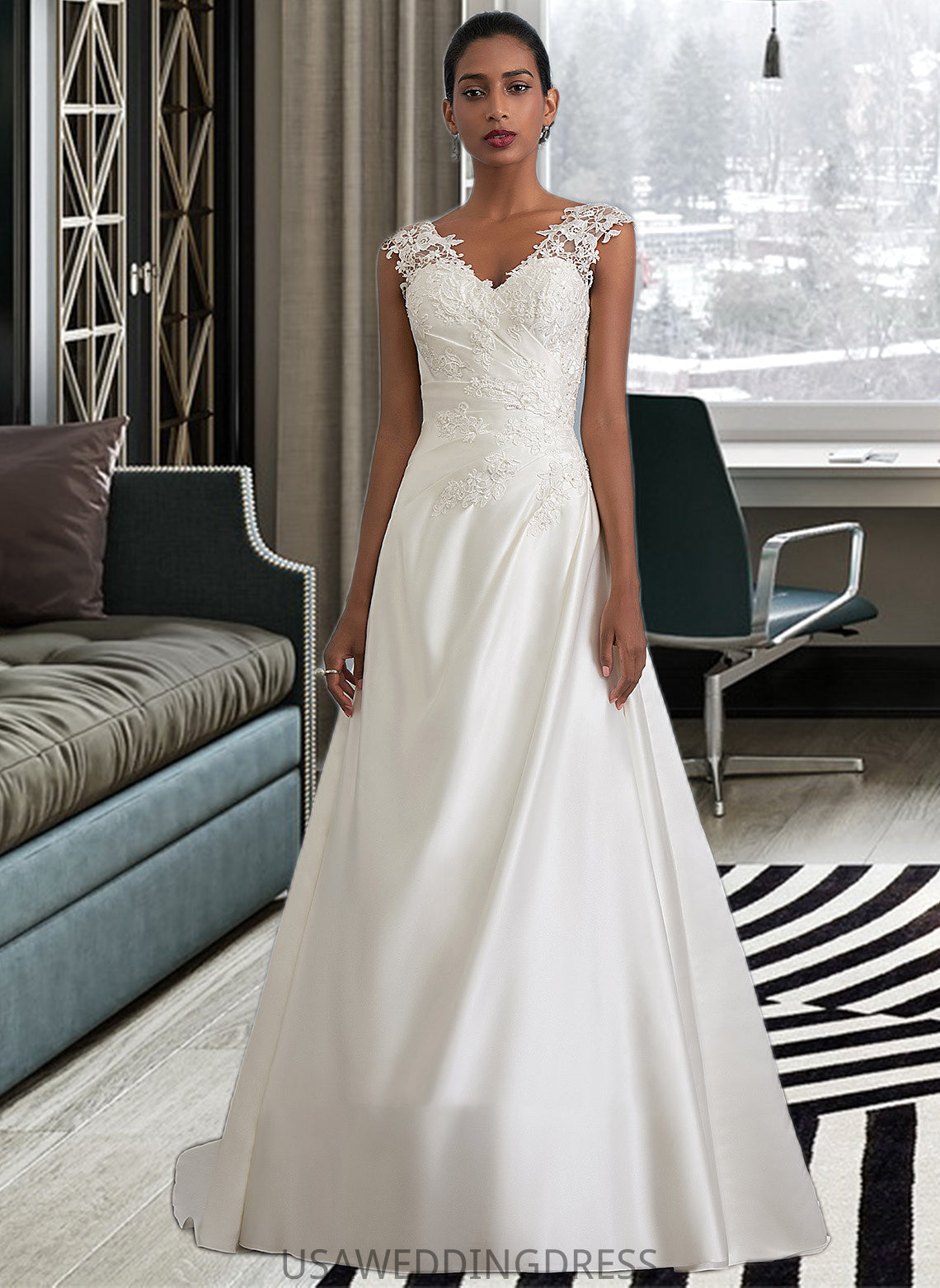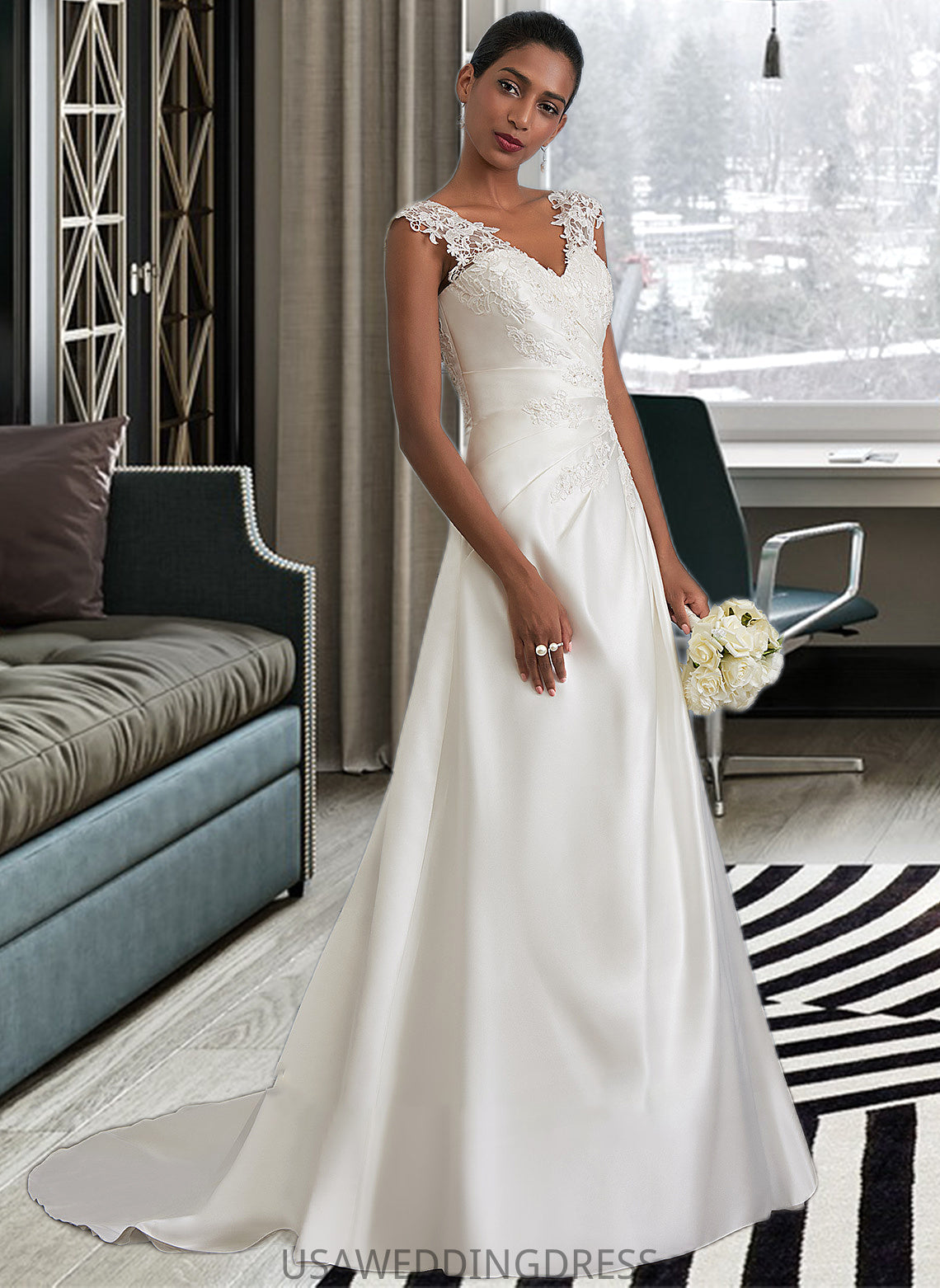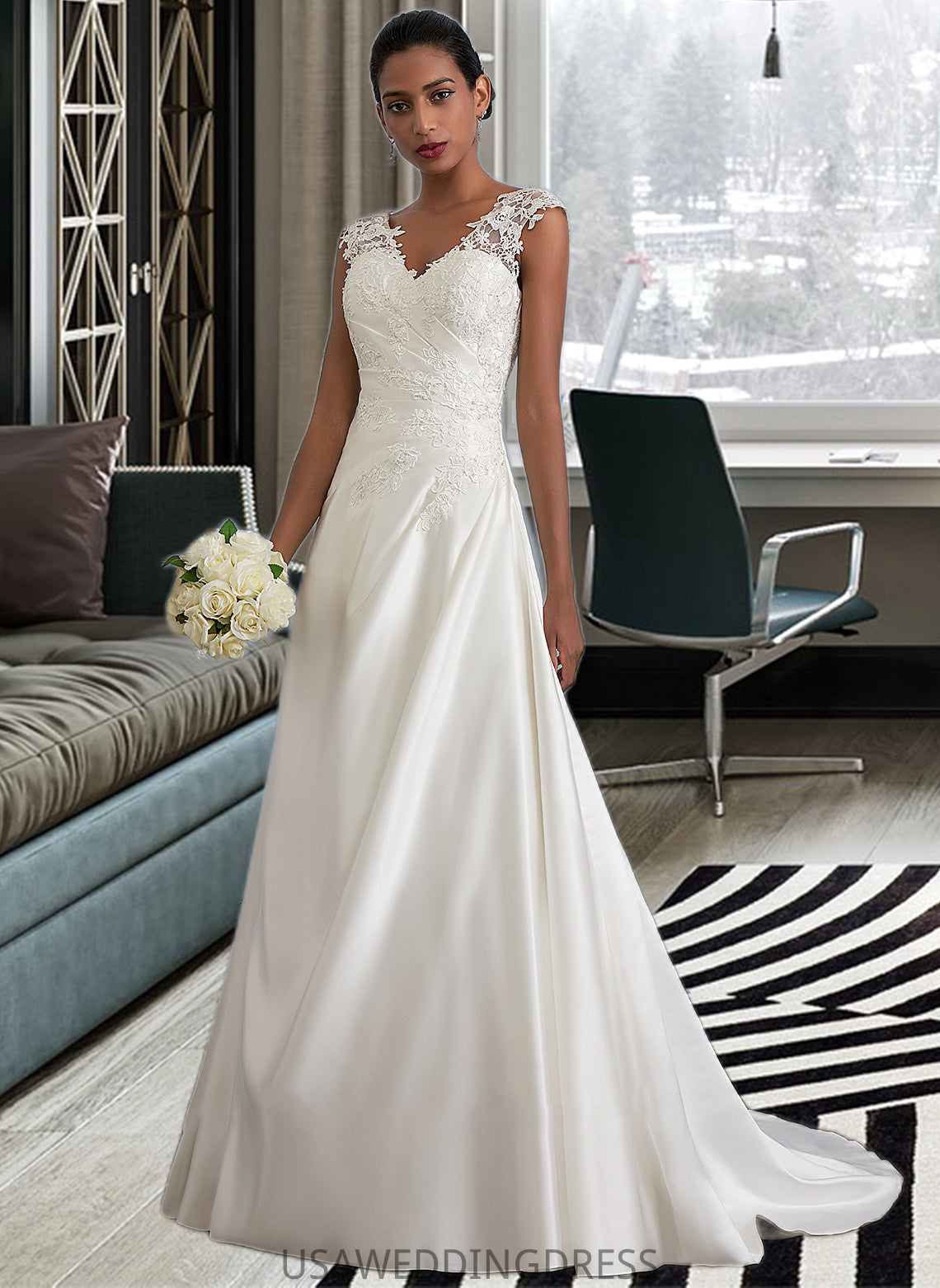 Parker Ball-Gown/Princess V-neck Sweep Train Satin Wedding Dress With Ruffle Beading Sequins DSP0013693