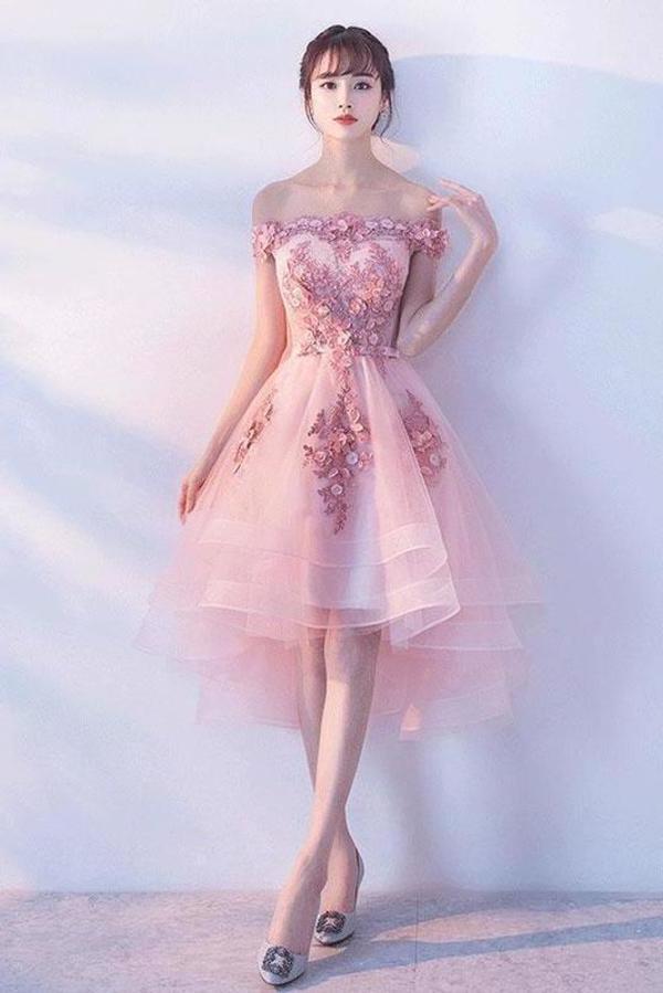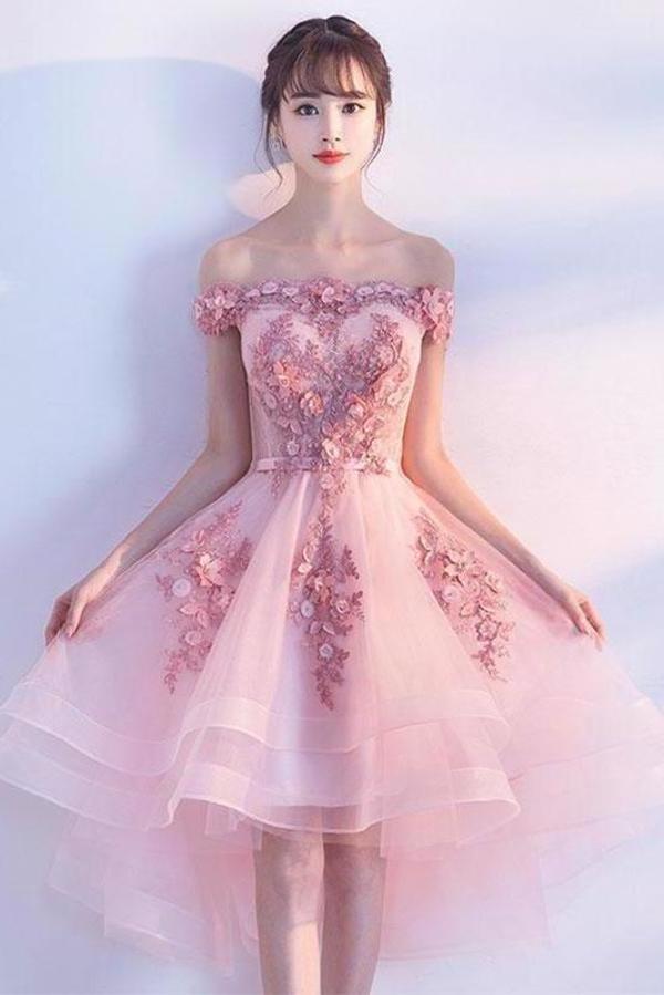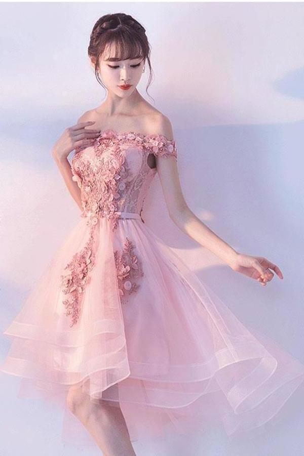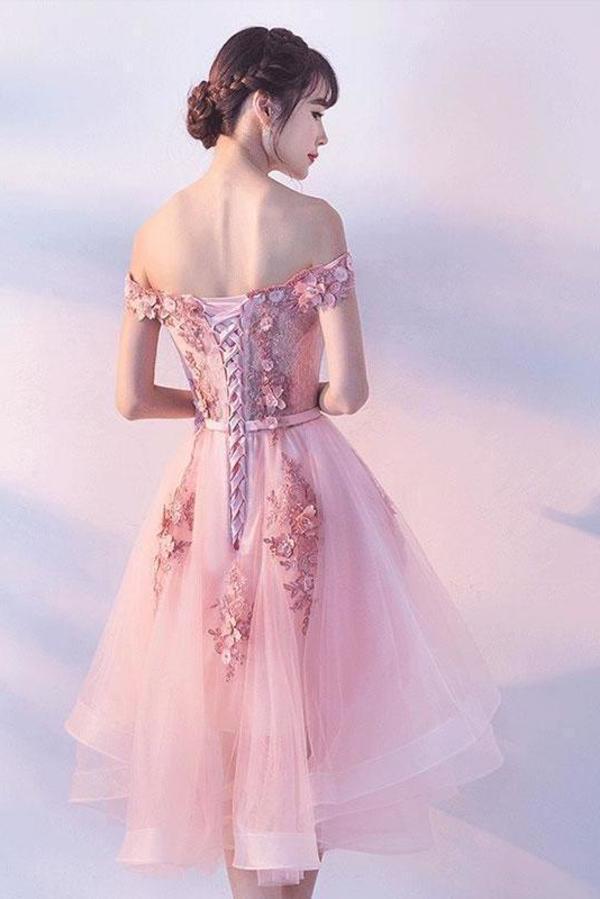 Pink Lace Tulle Short Prom Dress Off-the-Shoulder Appliques Lace up Homecoming Dresses SRSPST13190