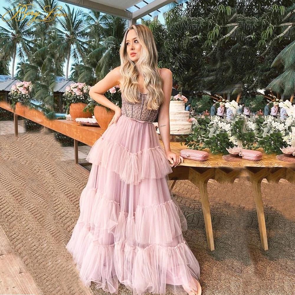 Pink Layers Prom Dresses Long A Line Beaded Party Dress Tiered Strapless Tulle Evening Dress