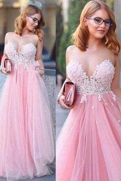 Pink Tulle Scoop Neck Princess Sweetheart Floor-length with Appliques Lace Prom Dresses RS807