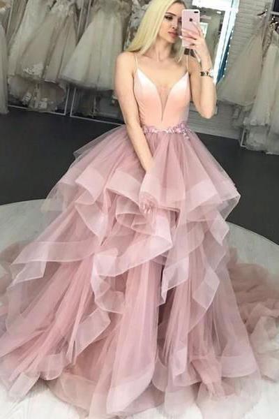 Pink Tulle Spaghetti Straps Ruffles Ball Gown Prom Dresses V Neck Long Evening Dresses P1081