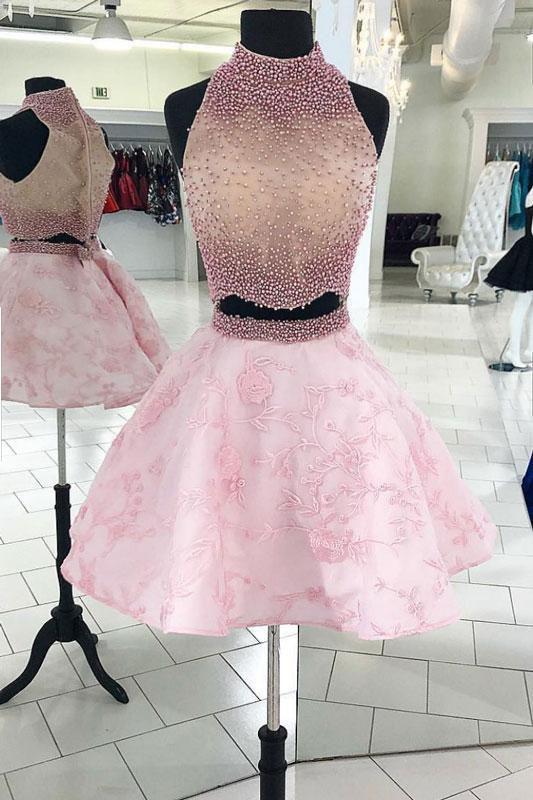 Pink Two Pieces Beads Lace Short Prom Dresses Halter Sleeveless Homecoming Dresses H1045