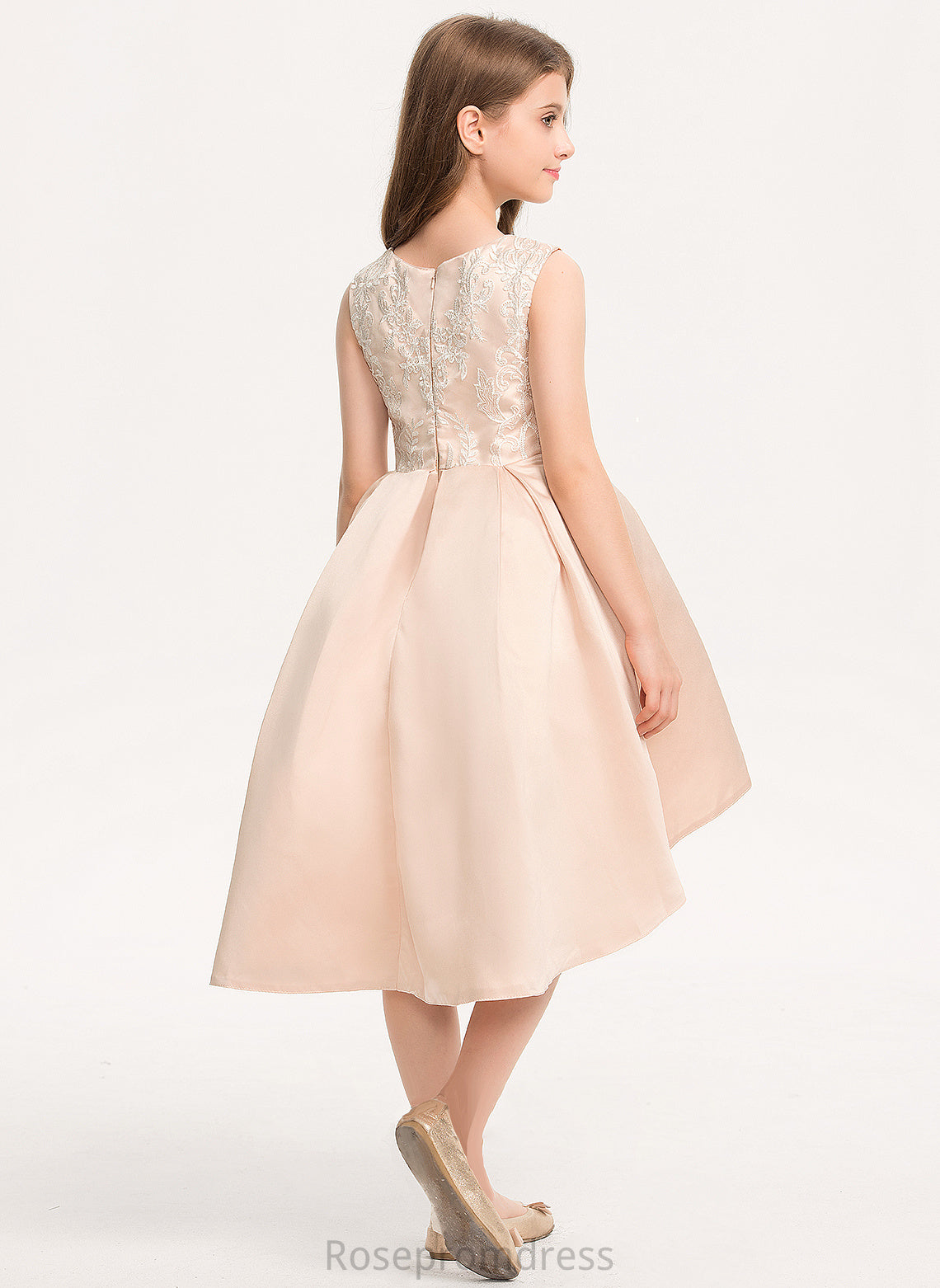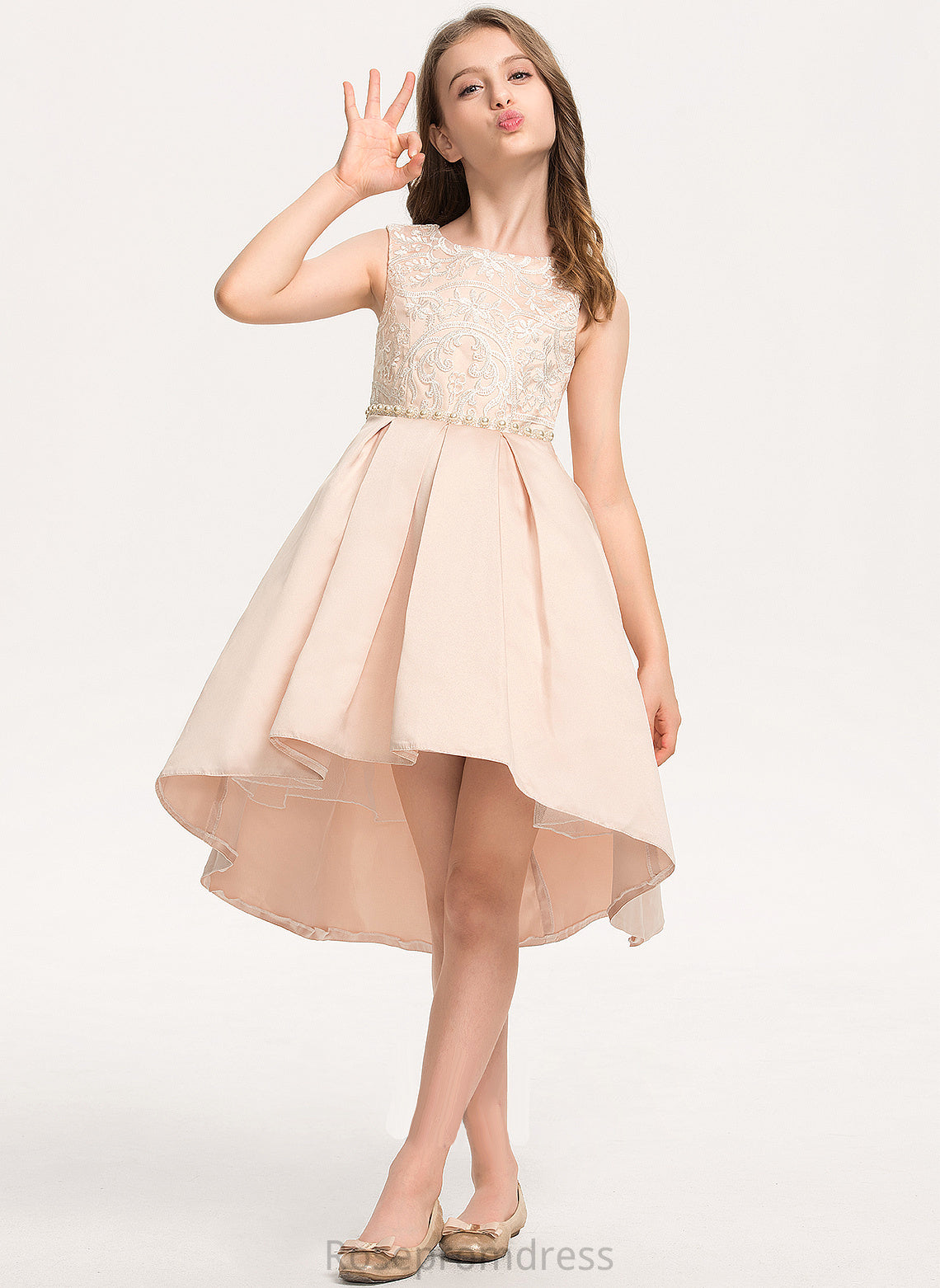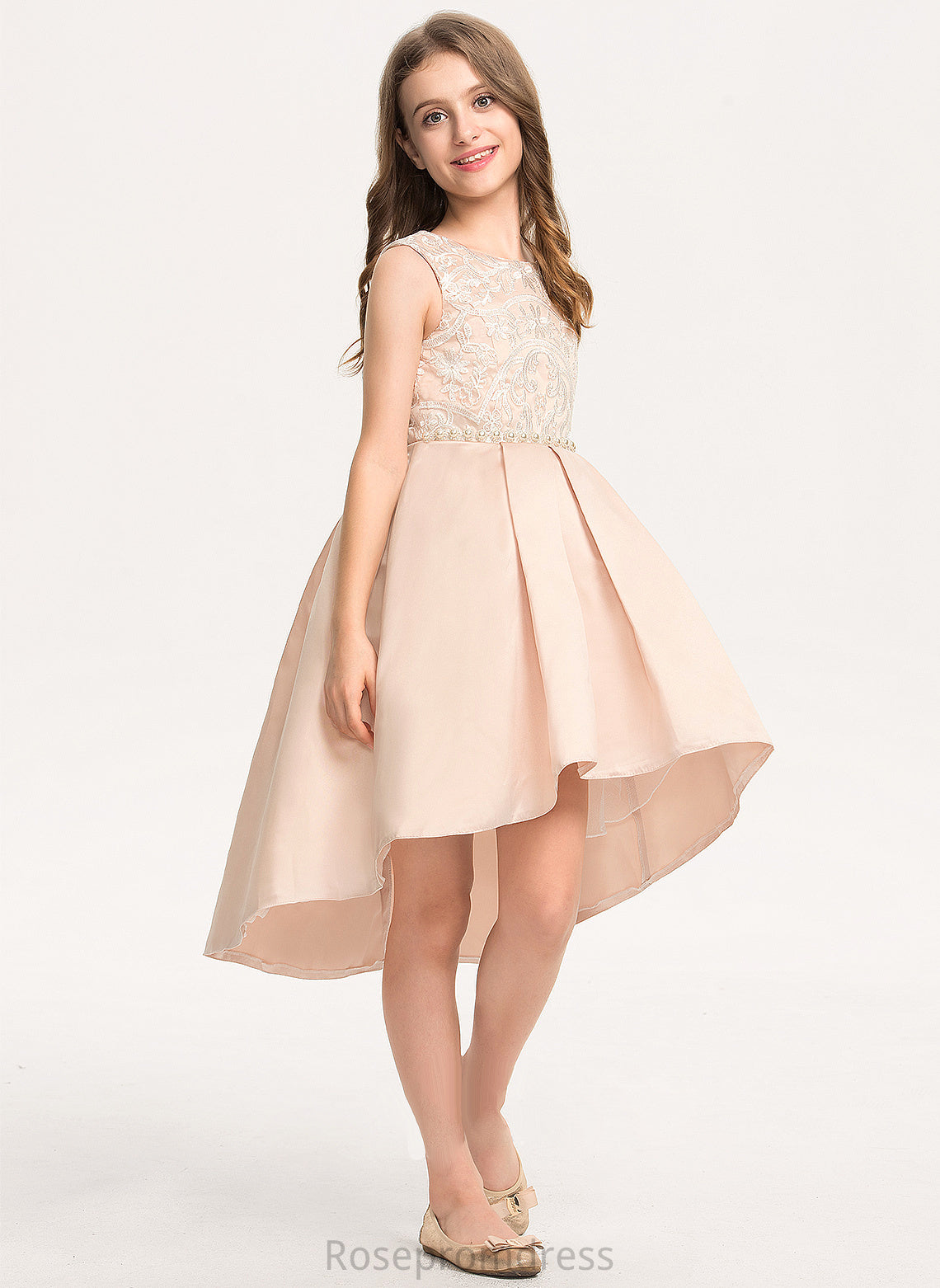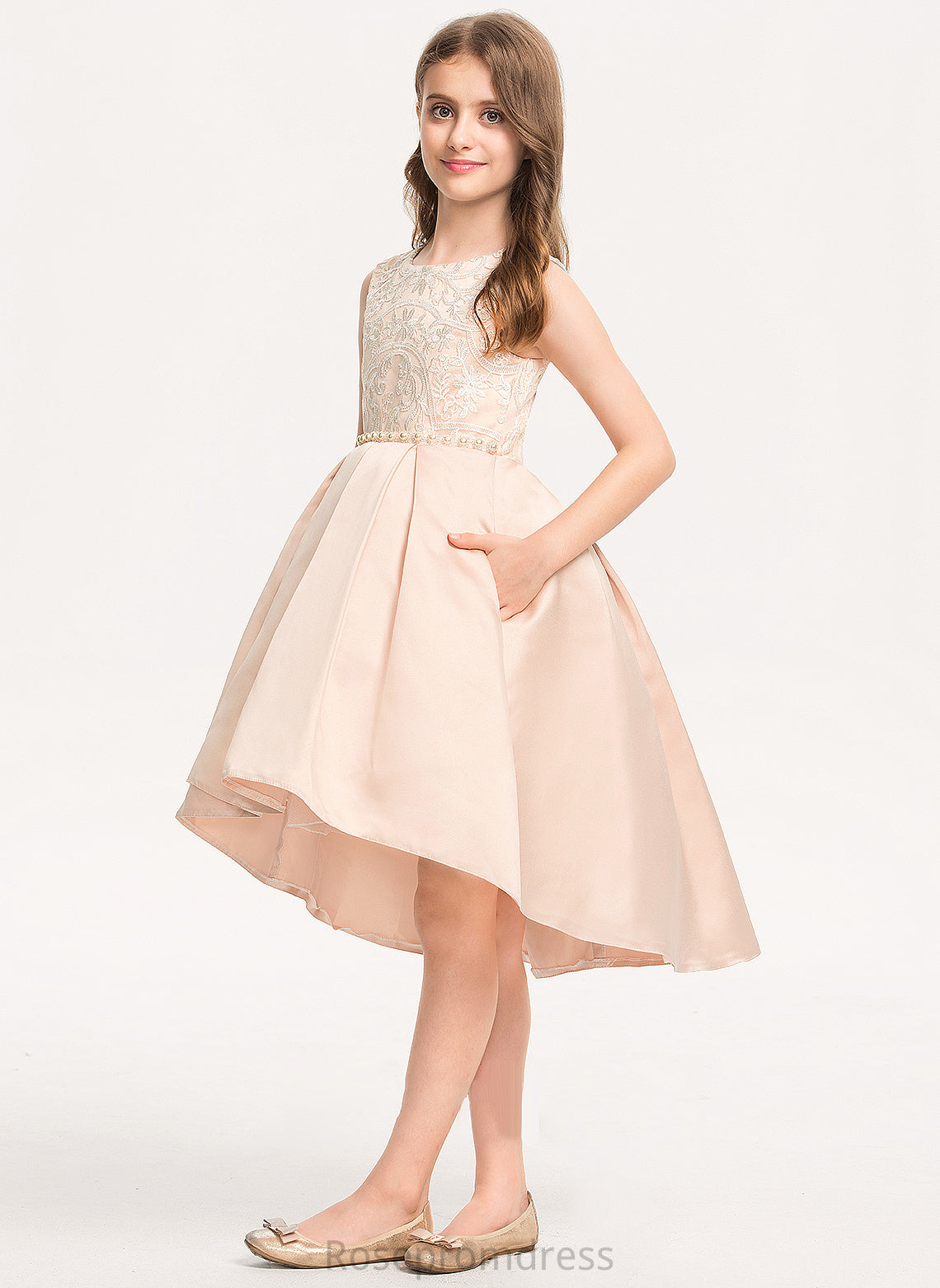 Pockets Asymmetrical A-Line Satin Lace Neck Junior Bridesmaid Dresses Scoop Beading With Mary