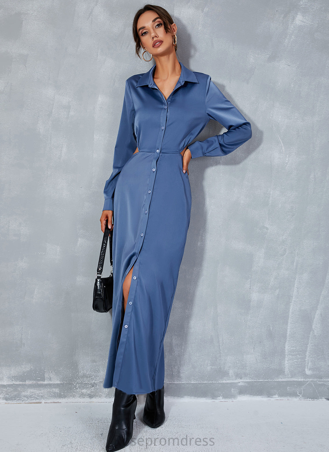 Polyester V-Neck A-line Casual Dresses Sleeves Long Front Split Makaila Club Dresses Midi