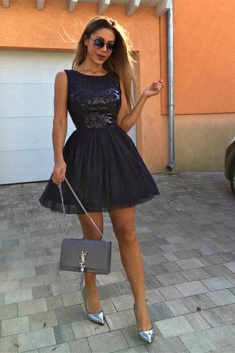 Popular Round Neck Sequins Dark Blue Short Prom Dresses Homecoming Dresses RS909