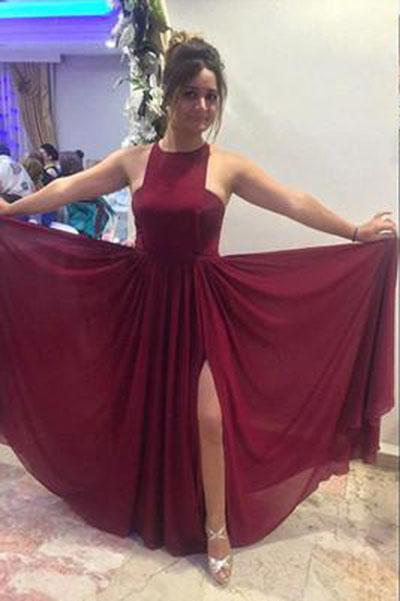 Pretty Burgundy Halter Sleeveless Long Chiffon Prom Dresses Open Back Prom Dresses RS135