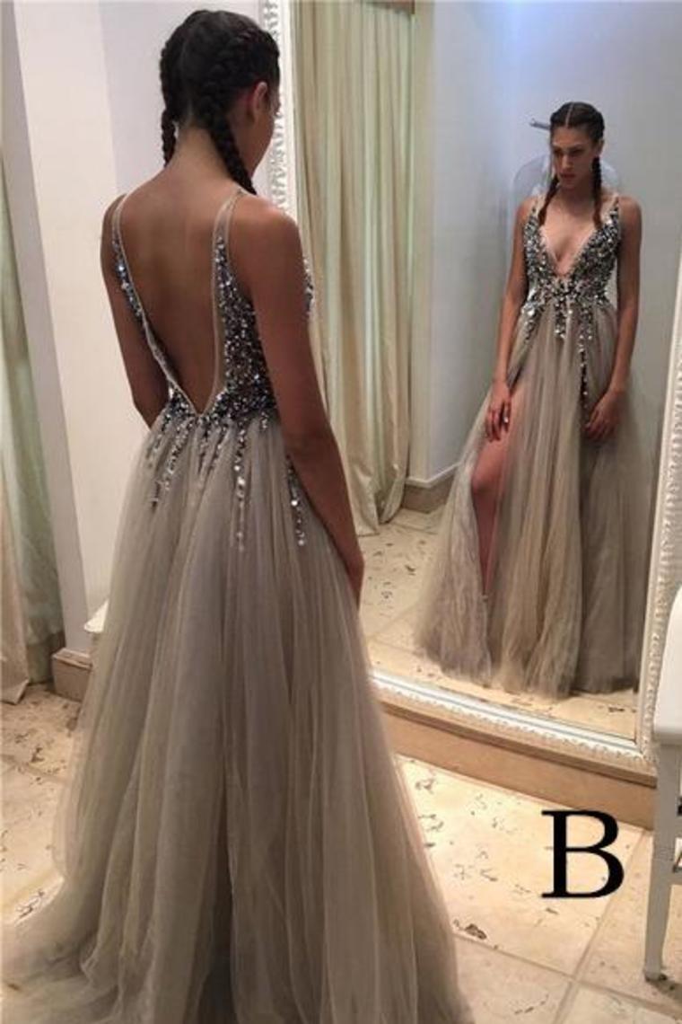 Pretty Deep V-Neck Long Beading Tulle A-Line Gray Prom Dresses