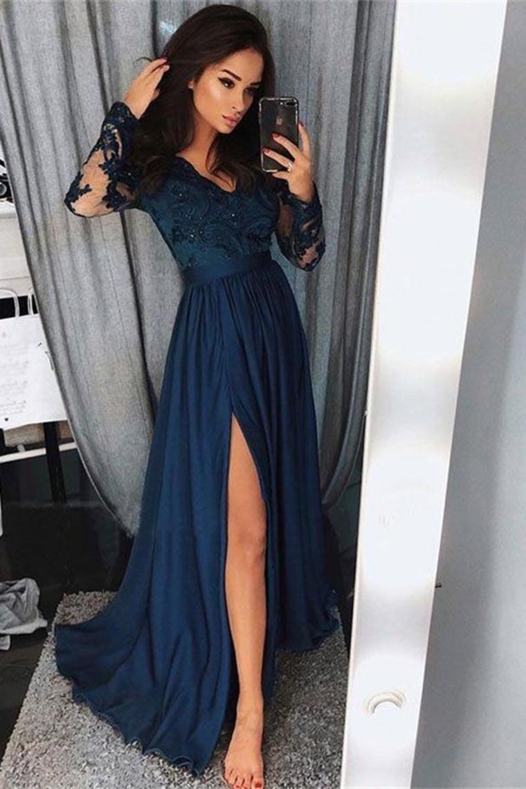 Pretty Long Sleevesl Navy Blue Lace Front Split Prom Dresses Women Dresses