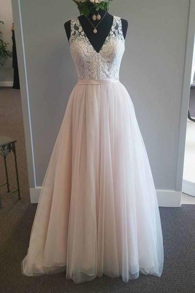Pretty pink tulle lace v-neck A-line long dress prom dress for teens