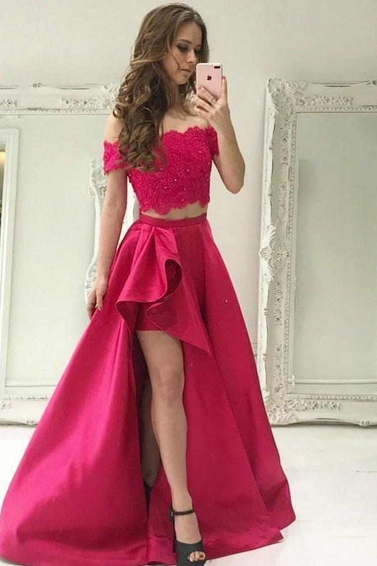 Pretty Two Pieces Ivroy Long Off The Shoulder Prom Dresses With Pockets