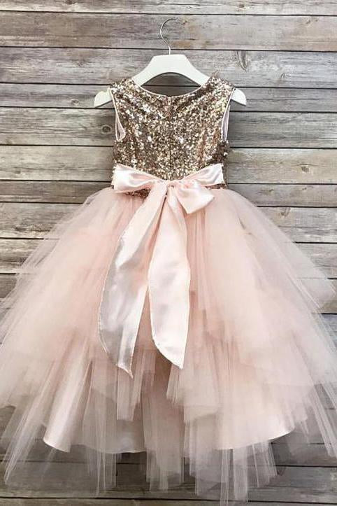 Princess A Line Gold Sequin Round Neck Blush Pink Cute Tulle Baby Flower Girl Dress RS828
