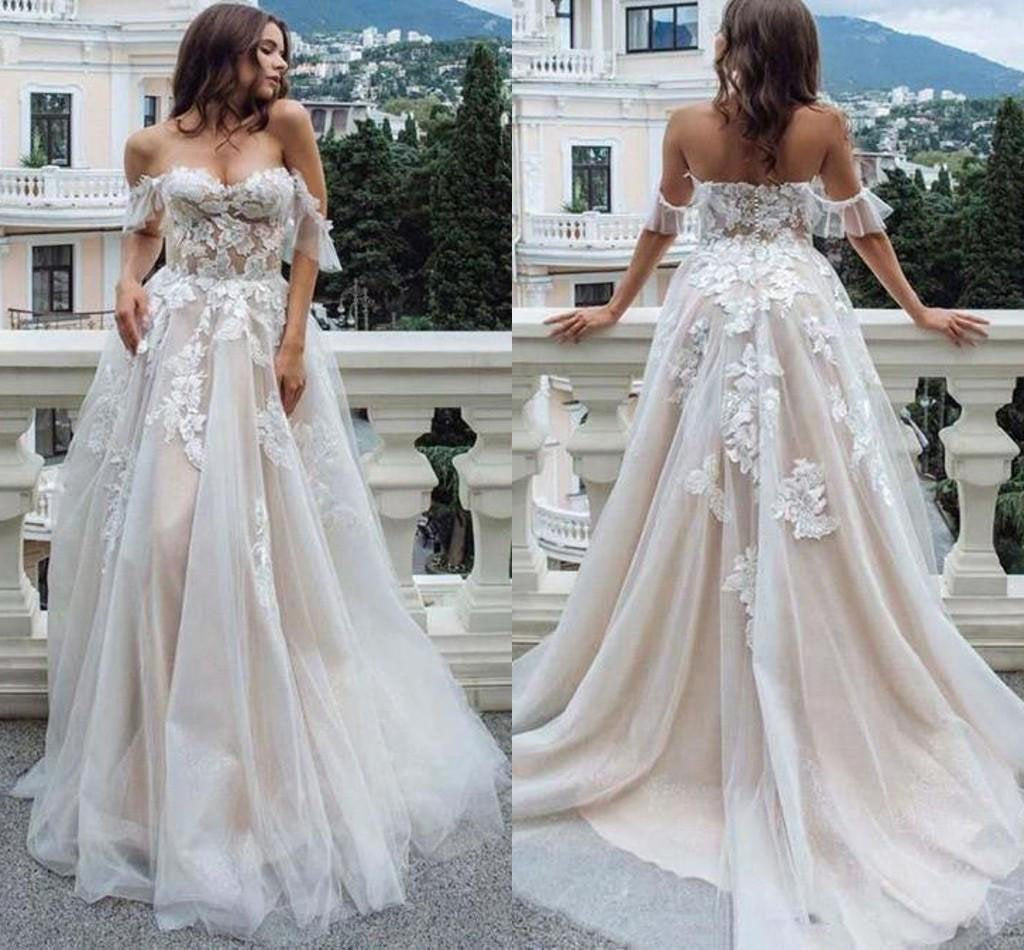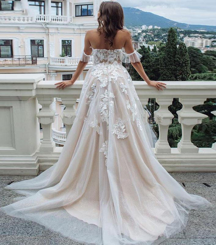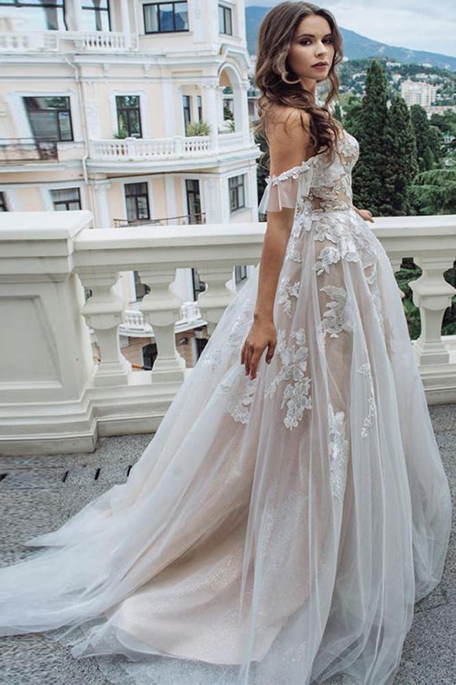Princess A Line Off the Shoulder Sweetheart Beach Wedding Dresses with Appliques SRS15585