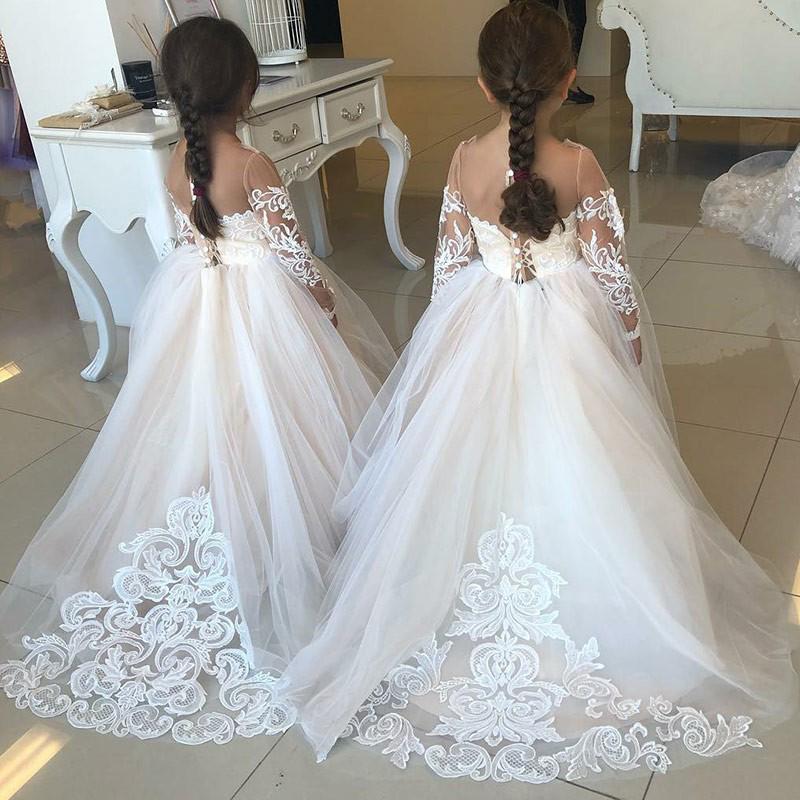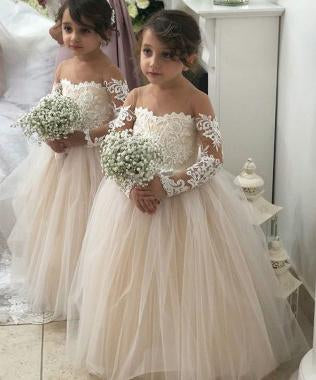 Princess A-Line Round Neck Tulle Long Sleeves Bowknot Flower Girl Dress with Appliques RS797