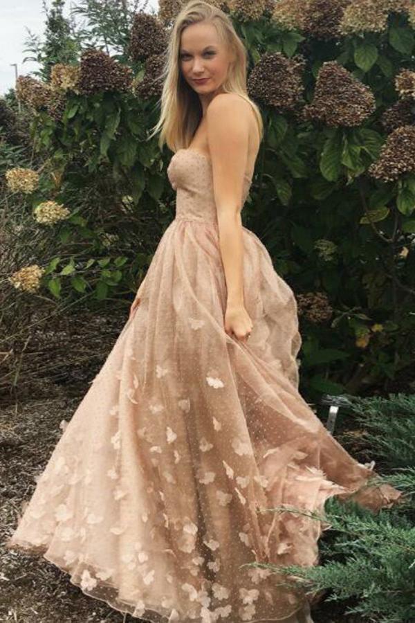 Princess A-Line Strapless Pink Lace Sleeveless Tulle Appliques Pockets Prom Dresses RS822