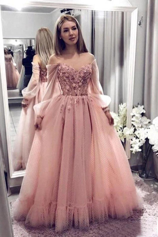 Princess Ball Gown Blush Pink Lace Off the Shoulder Prom Dresses With Long Sleeves P1098