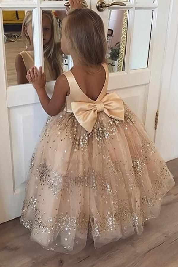 Princess Ball Gown Champagne Sequins Bowknot V Back Flower Girl Dresses SRS15291