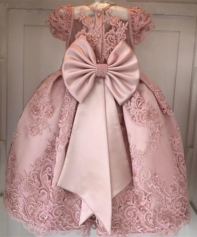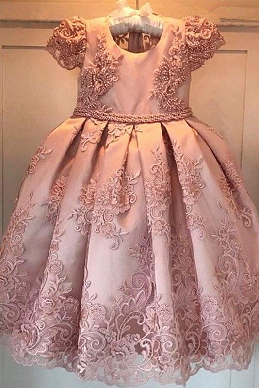 Princess Ball Gown Round Neck Pink Beads Flower Girl Dresses with Appliques SRS15587