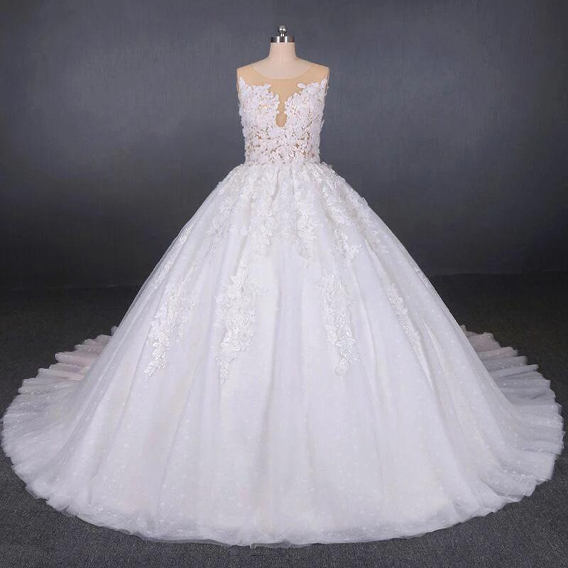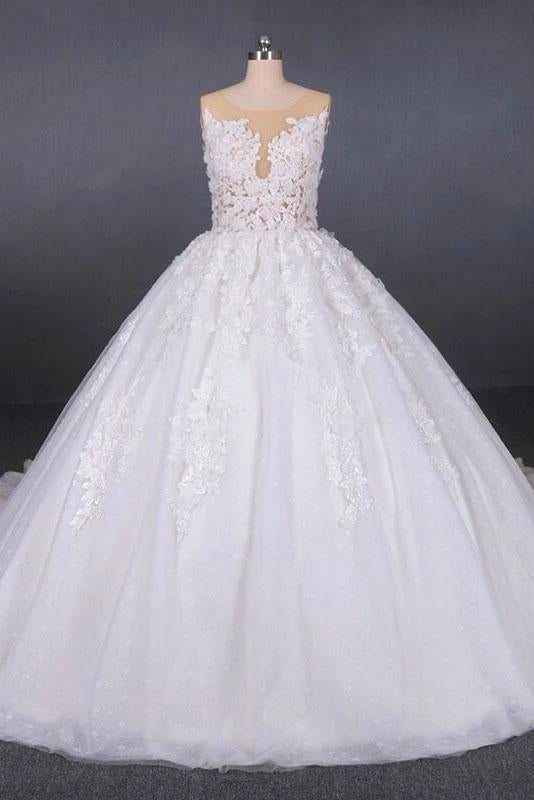 Princess Ball Gown Sheer Neck White Wedding Dresses Lace Appliqued Bridal Dresses SRS15293
