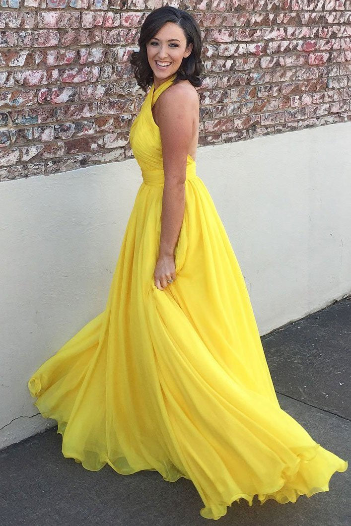 Princess Chiffon A-line Halter Long Yellow Backless Sleeveless Prom Dresses RS423