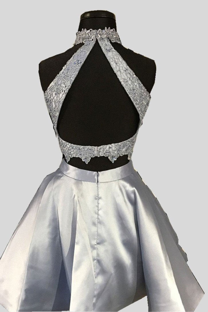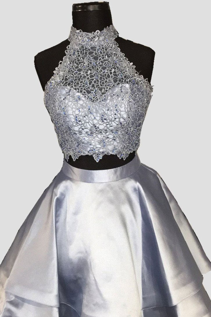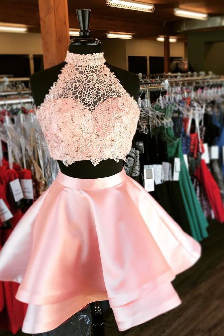 Princess Halter 2 Piece A-line Open Back Sleeveless Lace Mini Short Homecoming Dress RS246