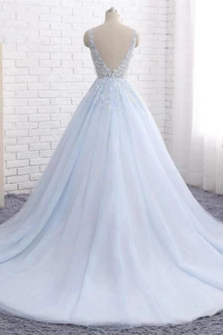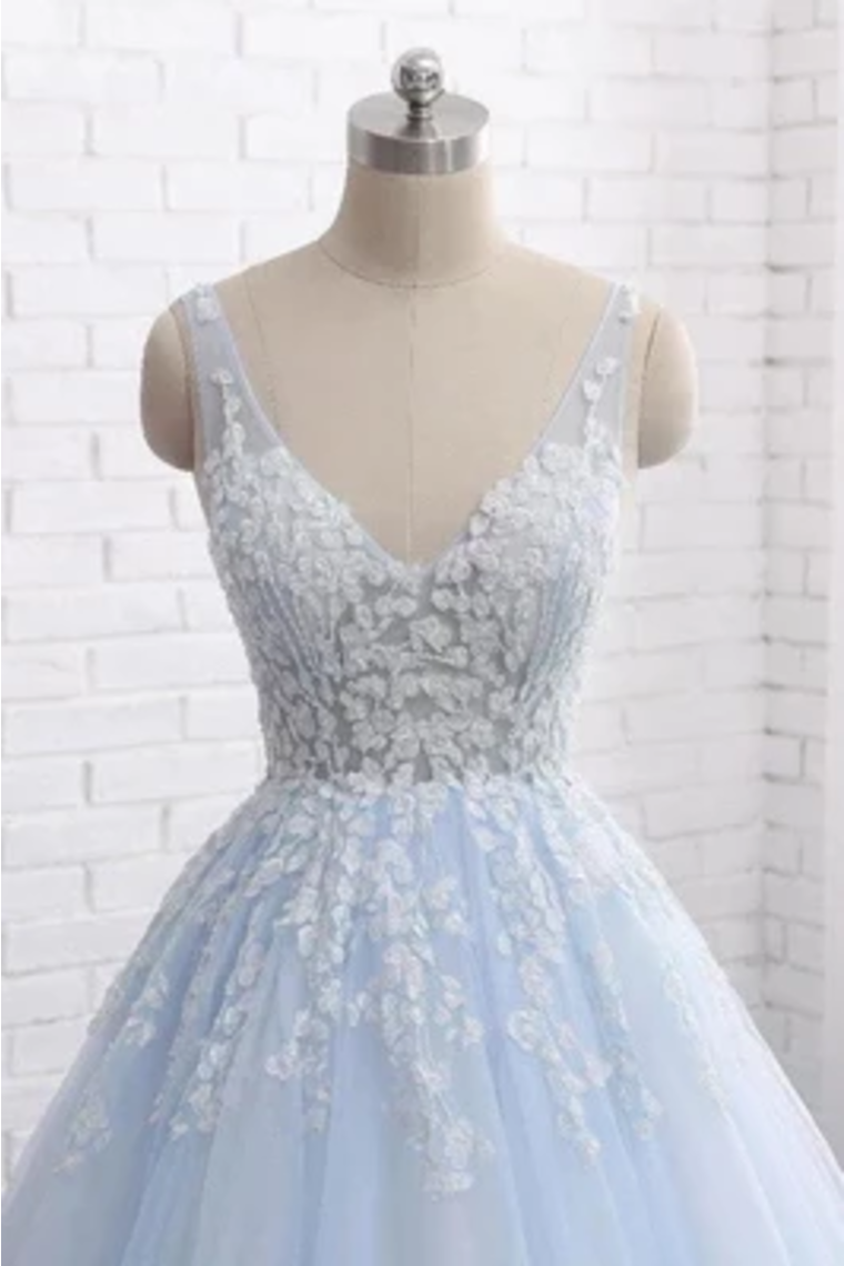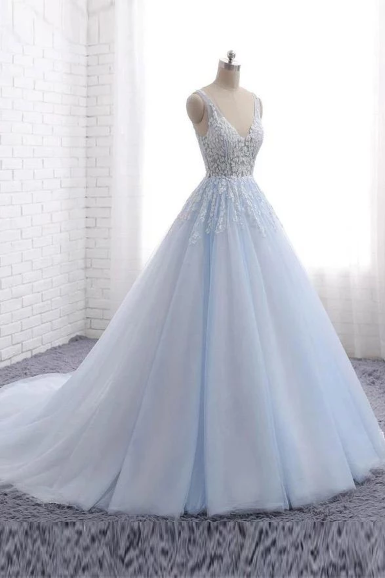 Princess Long Ball Gown Lace Tulle Prom Dresses, V Neck Formal Dresses