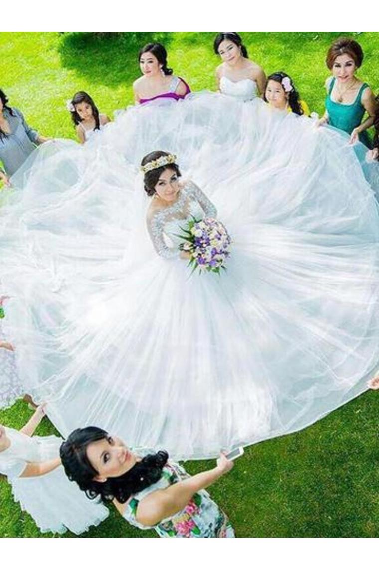 Princess Long Sleeves Bateau Ball Gown Tulle Wedding Dresses With Lace Appliques