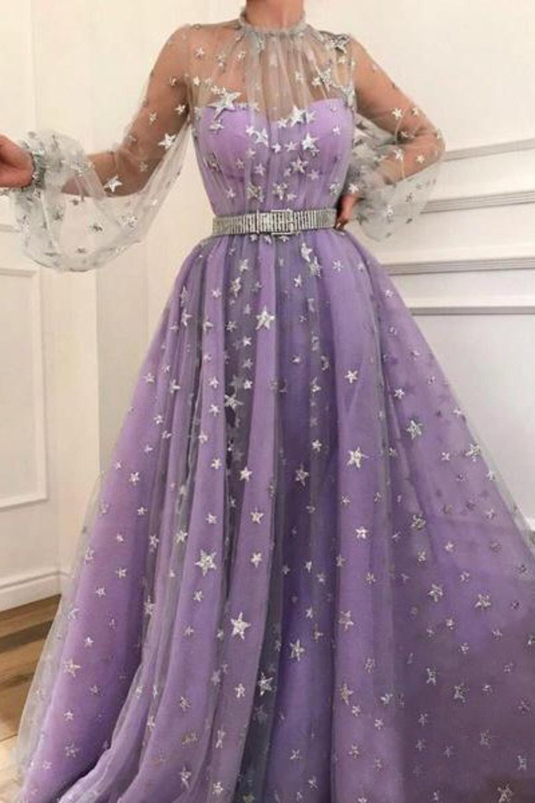 Prom Dress Long Sleeve Satin Lace A-Line Floor Length With Belt
