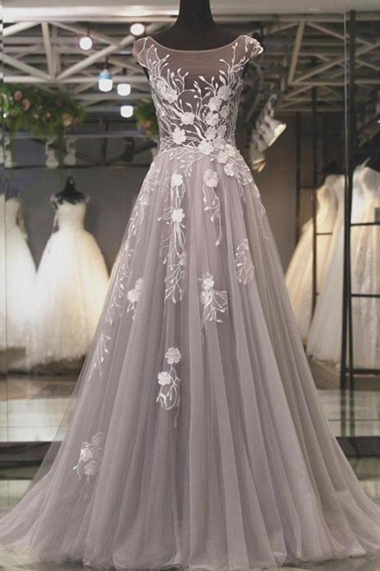 Prom Dress Scoop Lace Sweep Tulle With Appliques