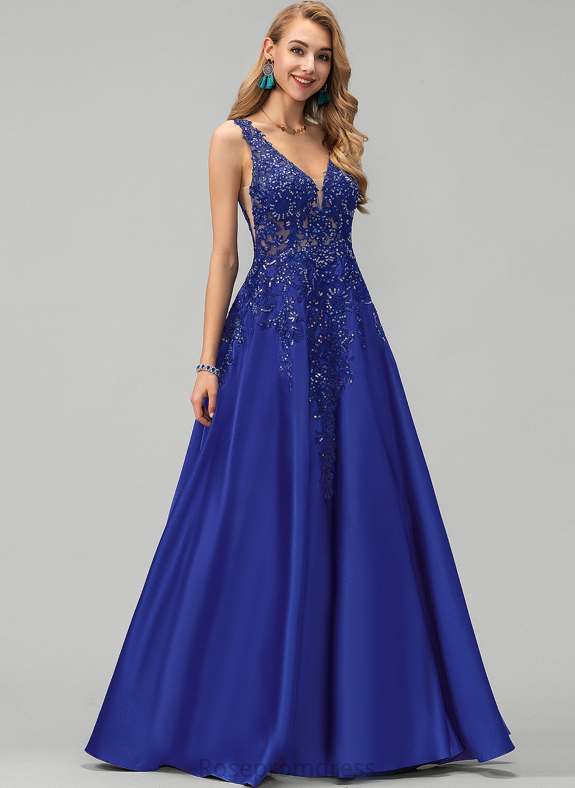Prom Dresses Floor-Length Sequins With A-Line Angelica Satin V-neck