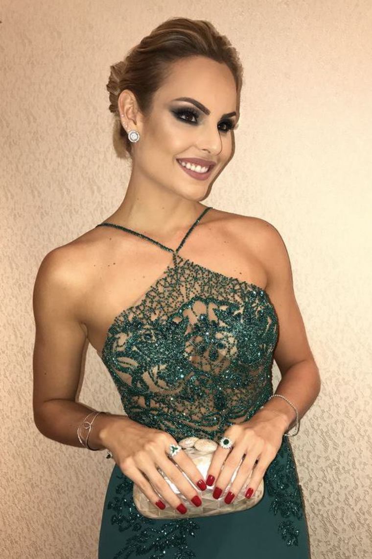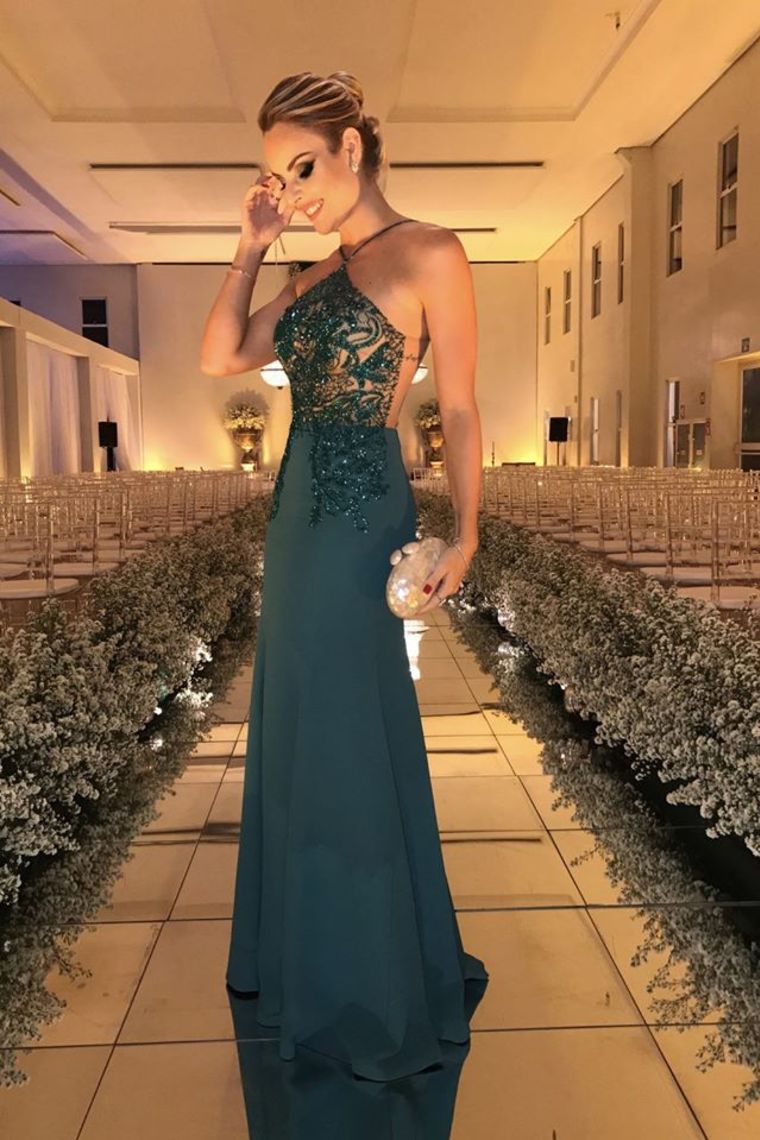 Prom Dresses Halter Sheath Spandex With Beads Appliques Floor Length