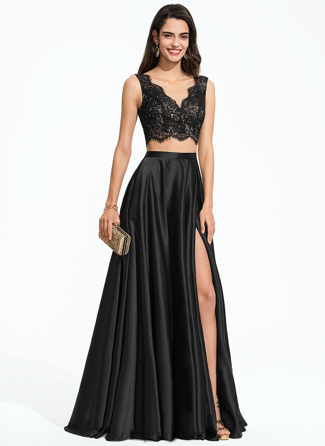 Prom Dresses Lace A-Line V-neck Satin Floor-Length Sanai