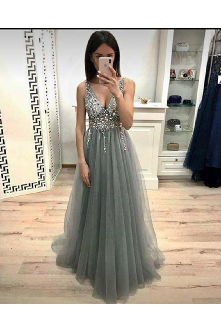 Prom Dresses V Neck Tulle Beads Floor Length