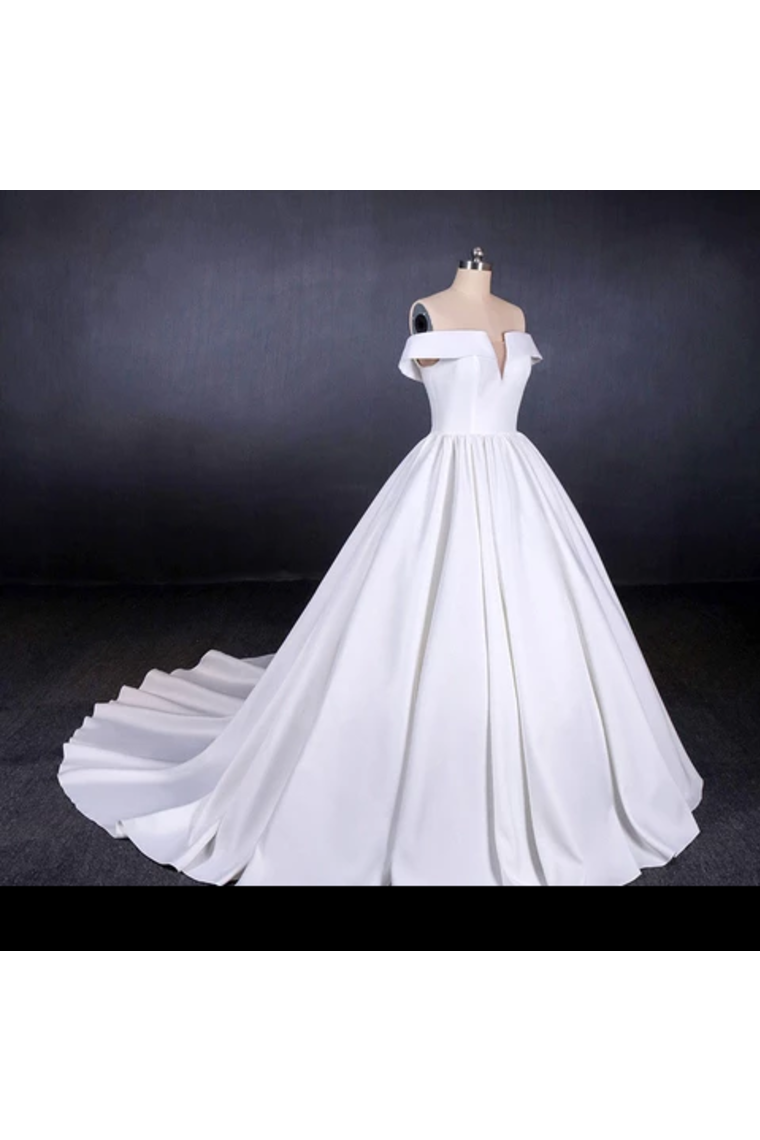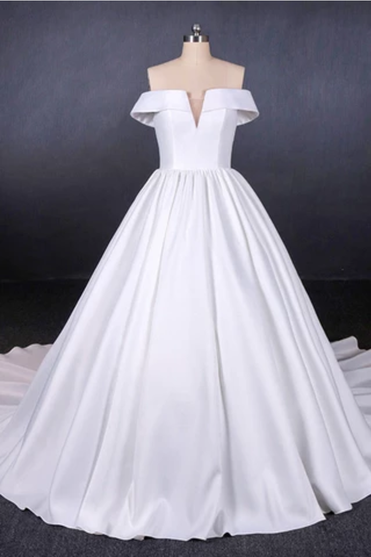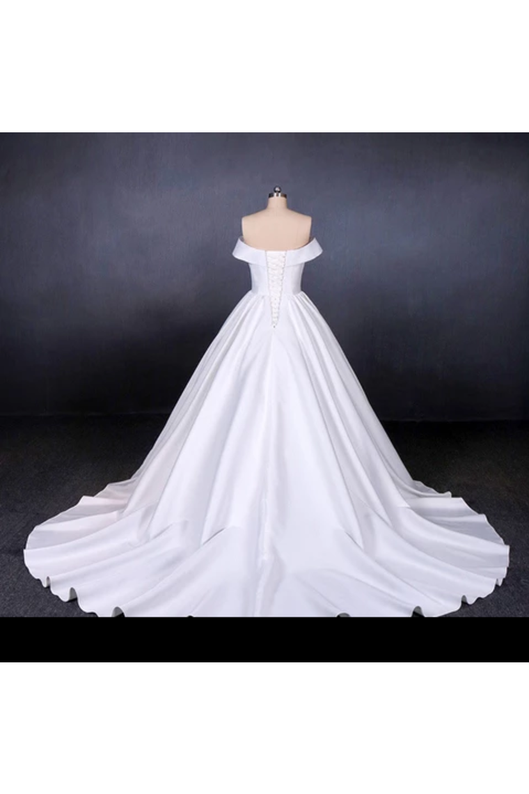 Puffy Off The Shoulder Satin Wedding Dress, Ball Gown Long Bridal Dress With Long Train
