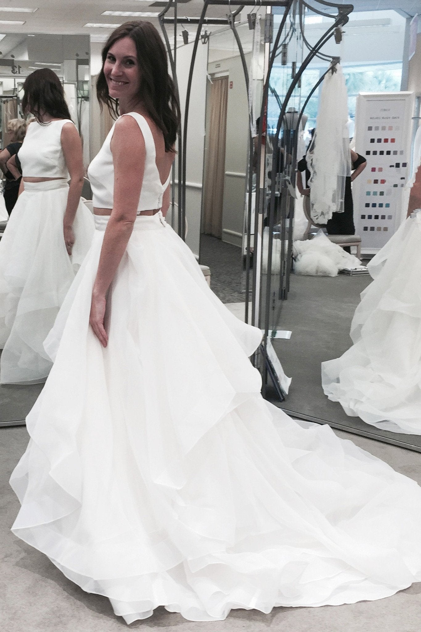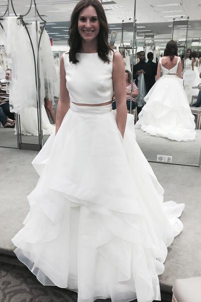 Pure white organza tiered two pieces round neck A-line long prom dresses