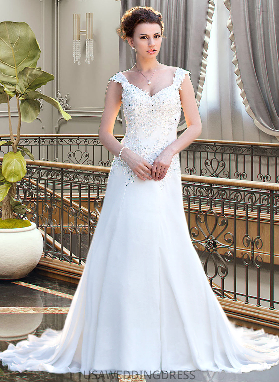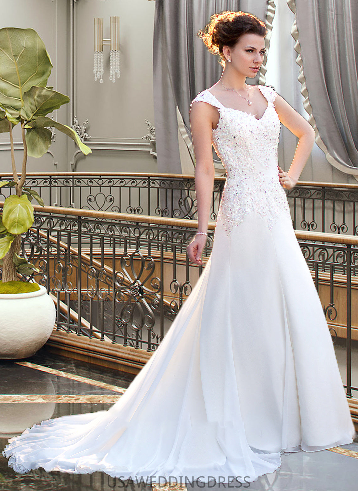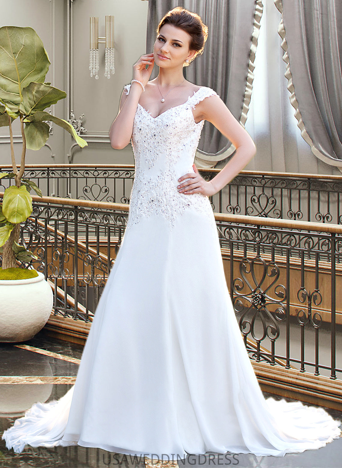 Rachel A-Line V-neck Court Train Chiffon Wedding Dress With Lace Beading Sequins DSP0013776