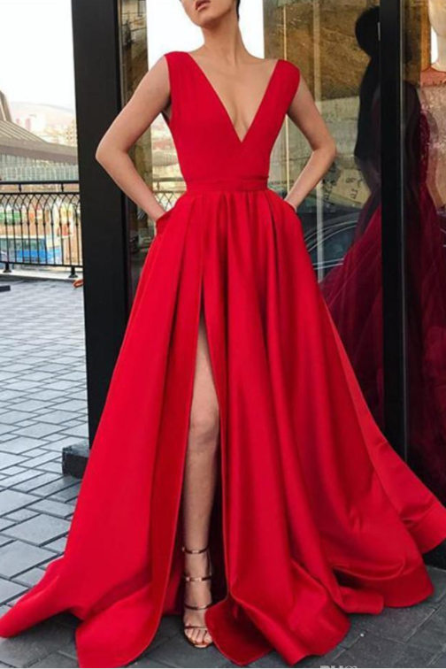 Red A Line Deep V Neck Split Prom Dresses with Pockets Strap High Slit Evening Dress RS481