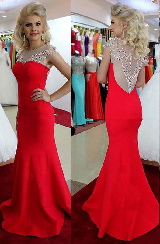Red Beading Floor Length Satin Mermaid Prom Dresses Evening Dresses
