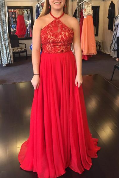 Red chiffon lace top halter A-line long evening dresses formal dresses for prom