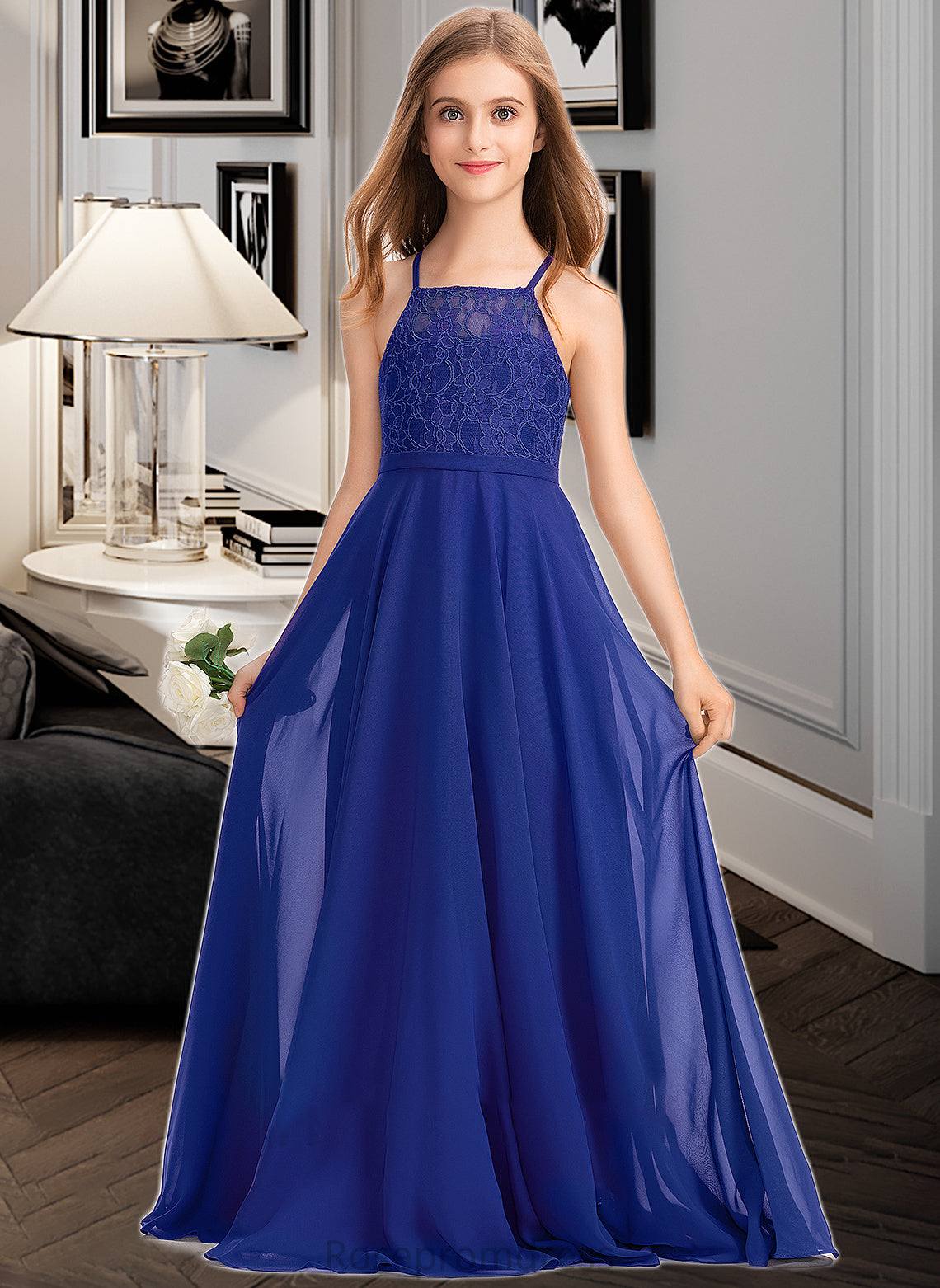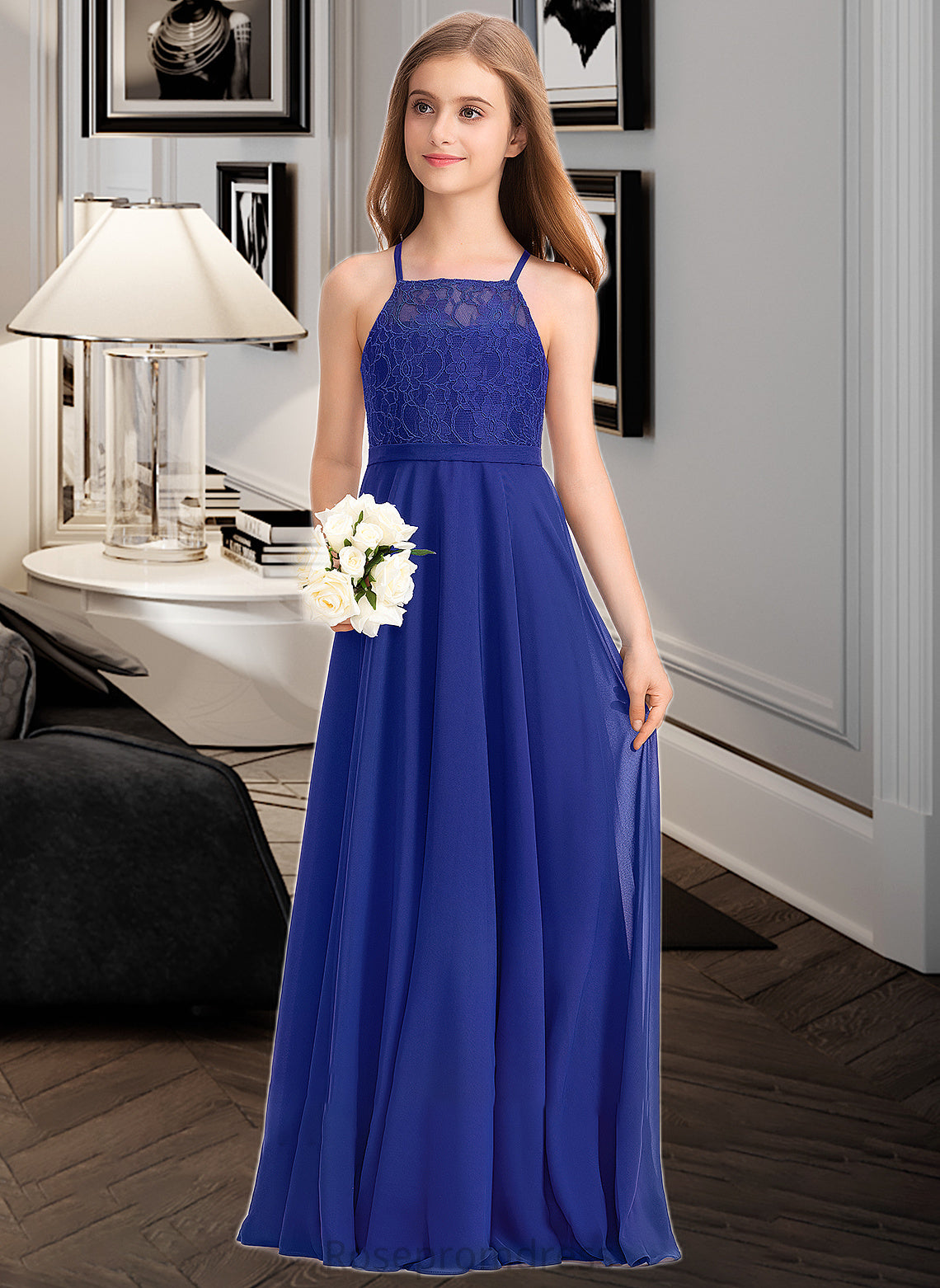 Riya A-Line Square Neckline Floor-Length Chiffon Lace Junior Bridesmaid Dress SRSP0013457
