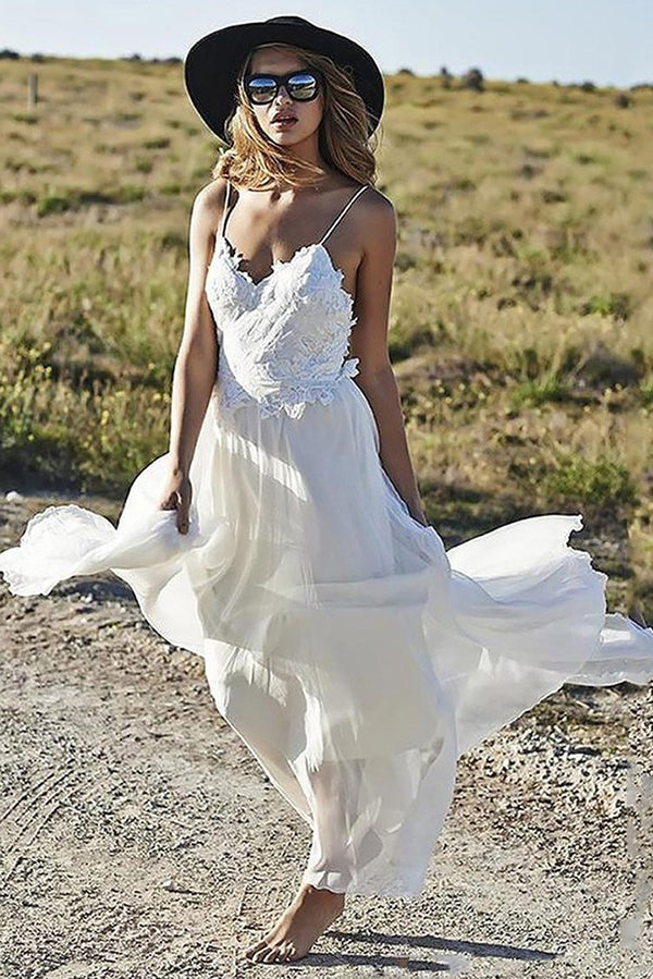 Romantic Spaghetti Straps Backless Lace Appliques Floor Length Beach Wedding Dresses