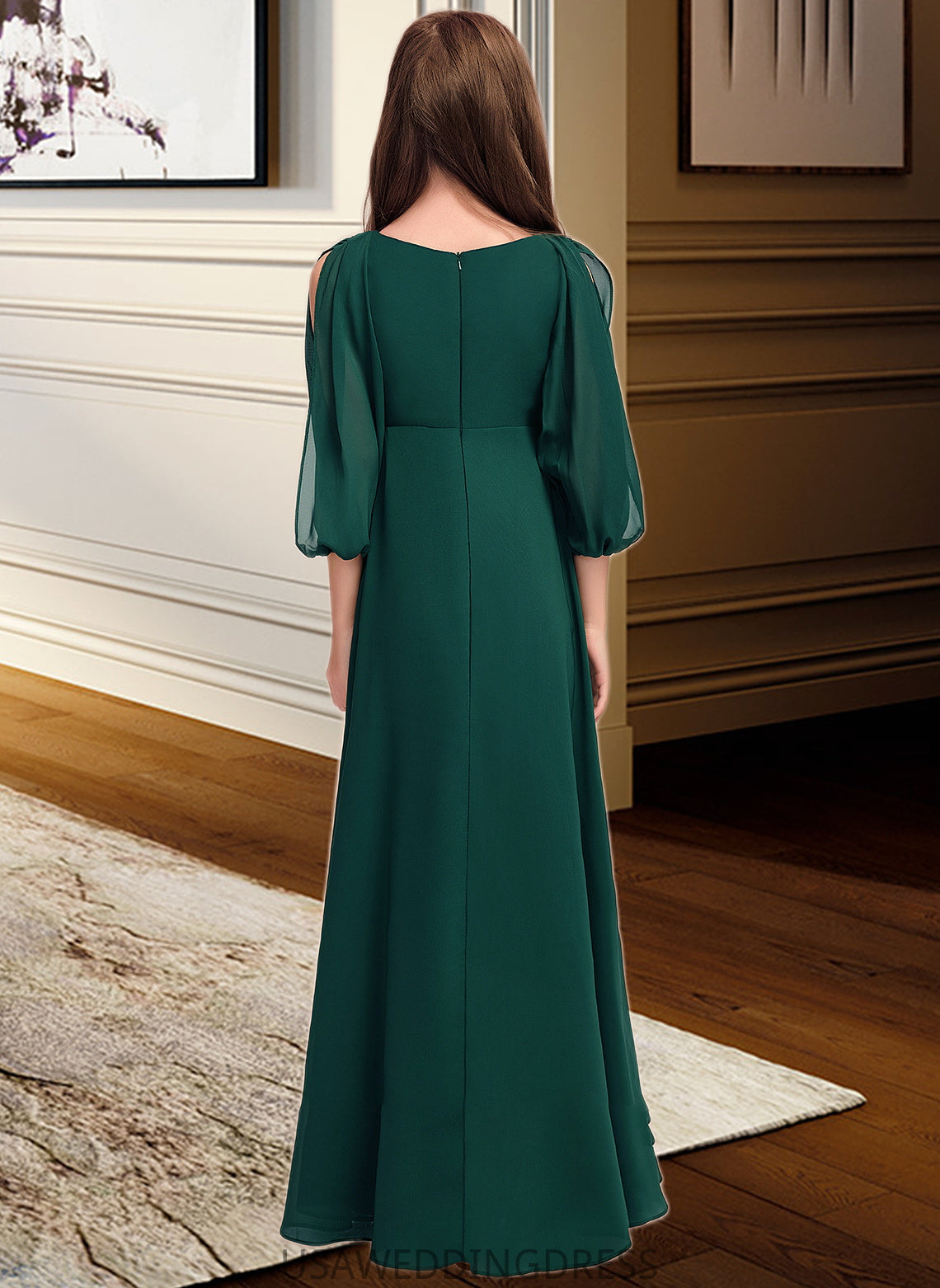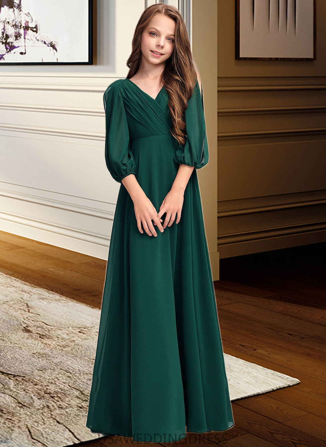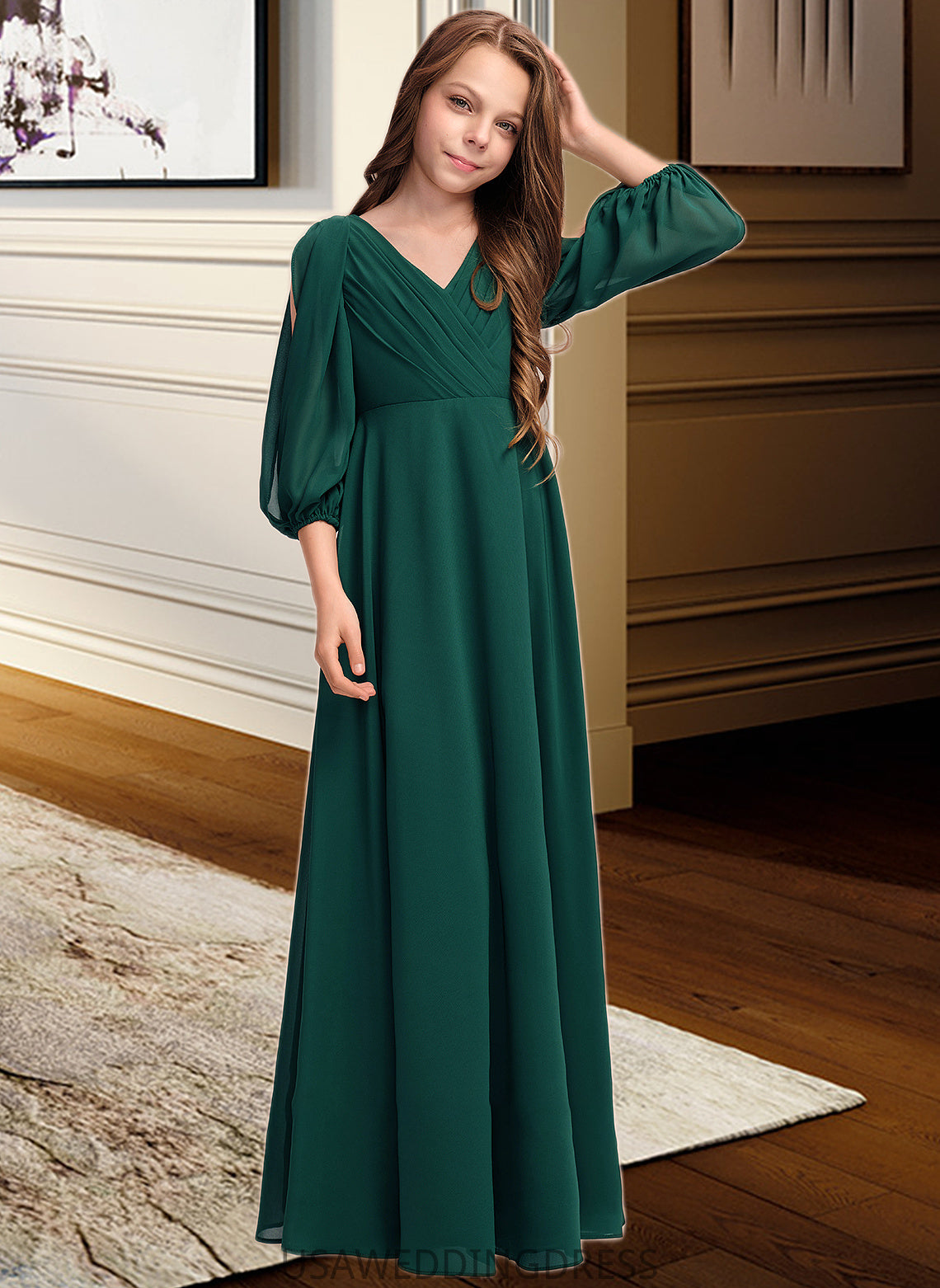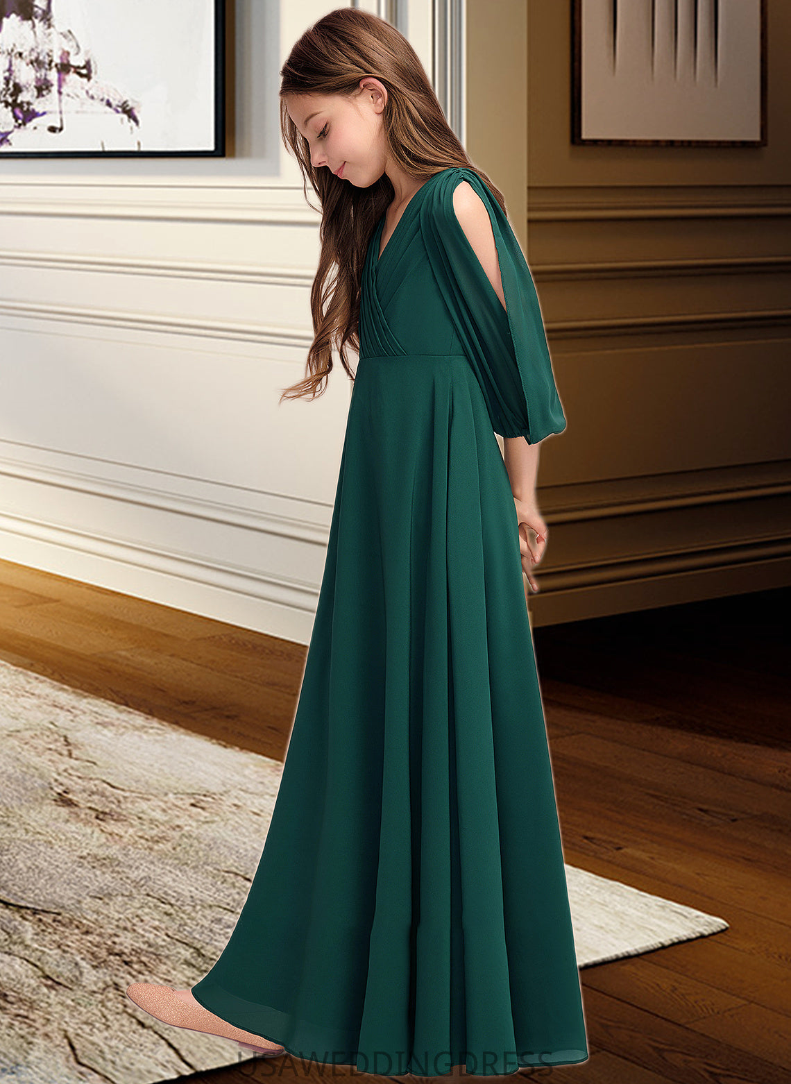 Rosa A-Line V-neck Floor-Length Chiffon Junior Bridesmaid Dress With Ruffles DSP0013427