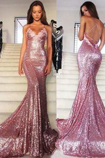 Rose Gold Sequin Mermaid Long Spaghetti Strap Sexy Backless Dresses For Prom RS133