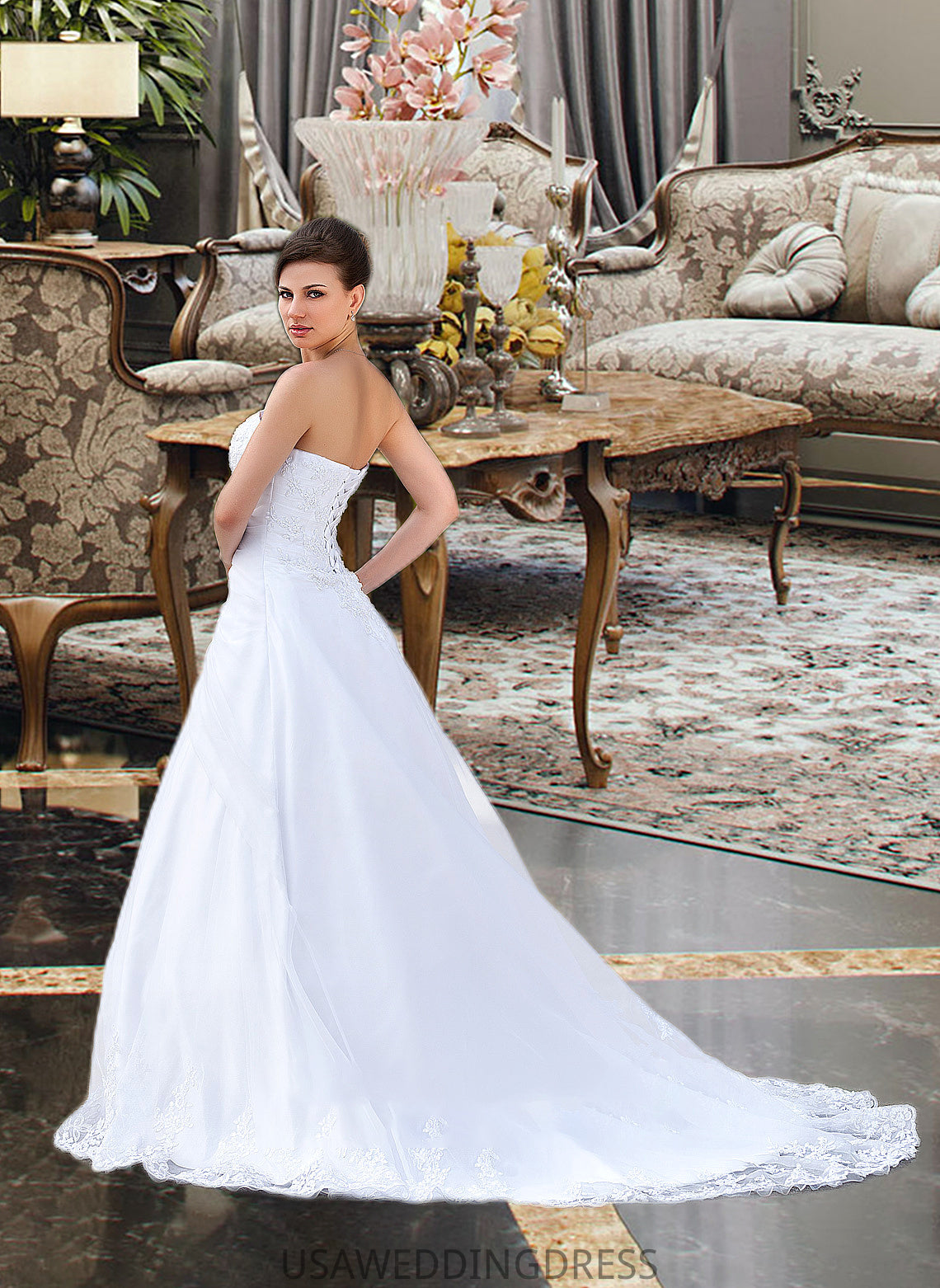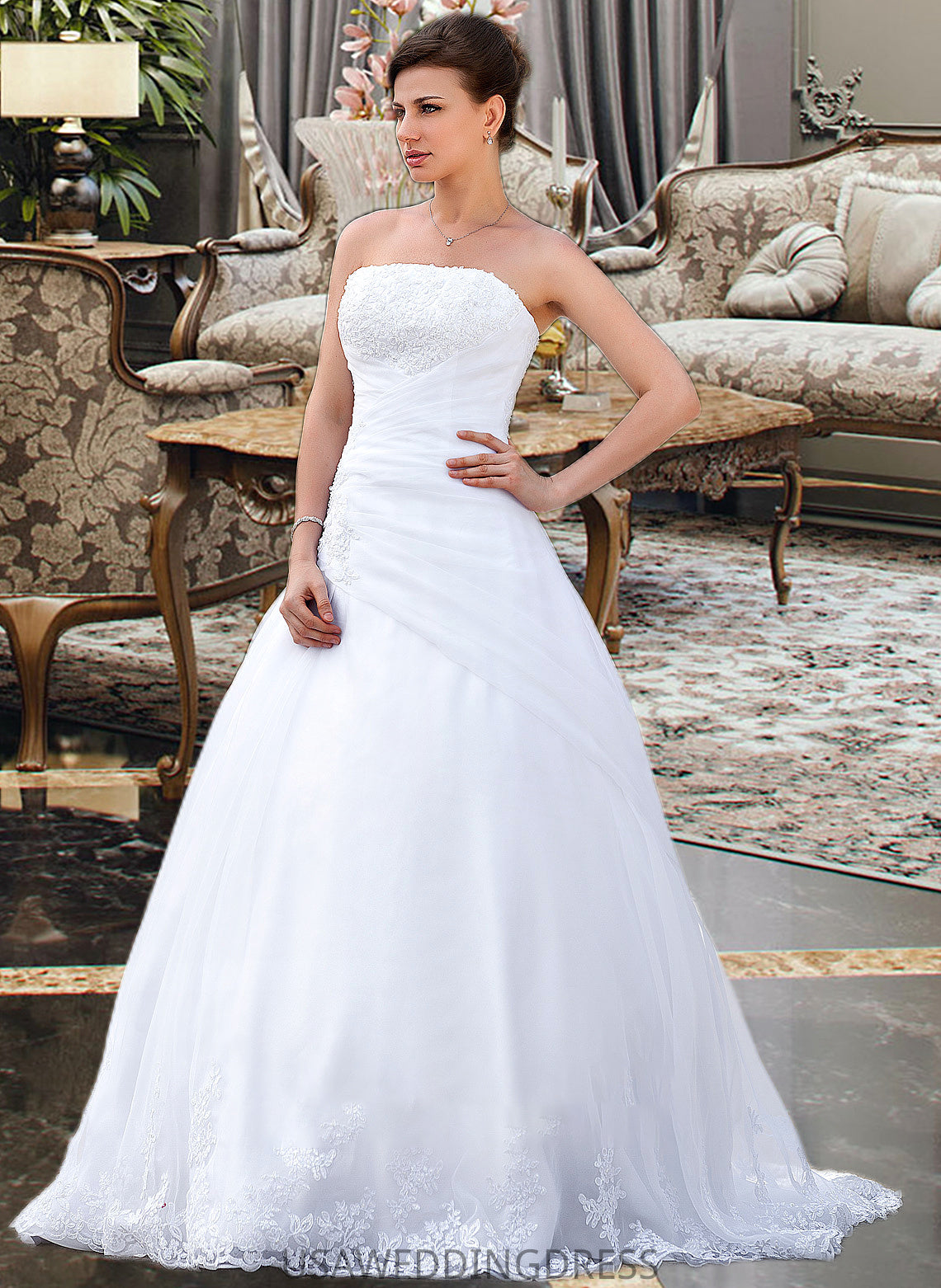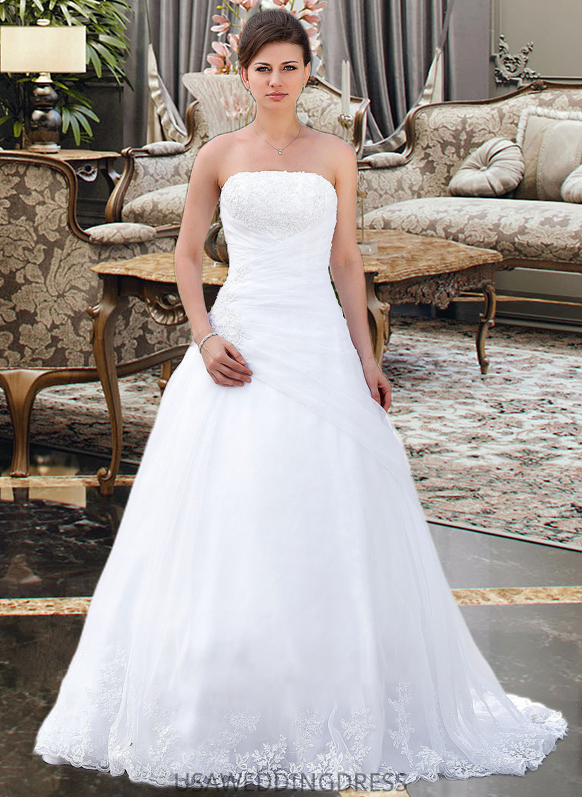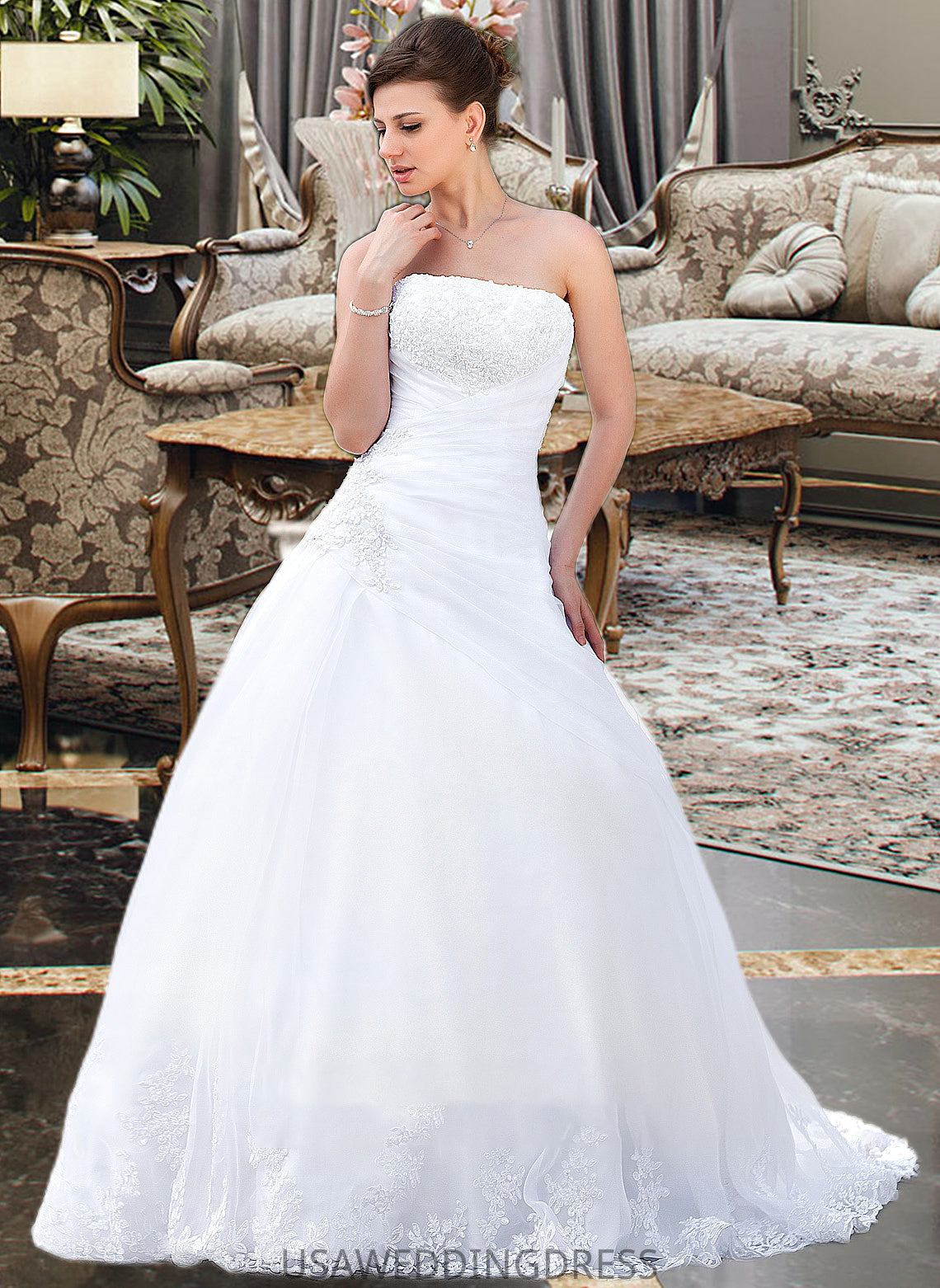 Rosemary Ball-Gown/Princess Strapless Chapel Train Satin Organza Wedding Dress With Lace Beading DSP0013796