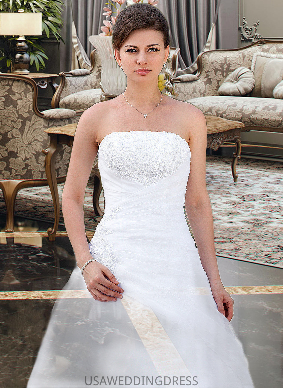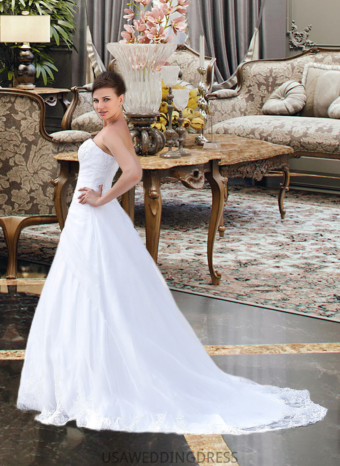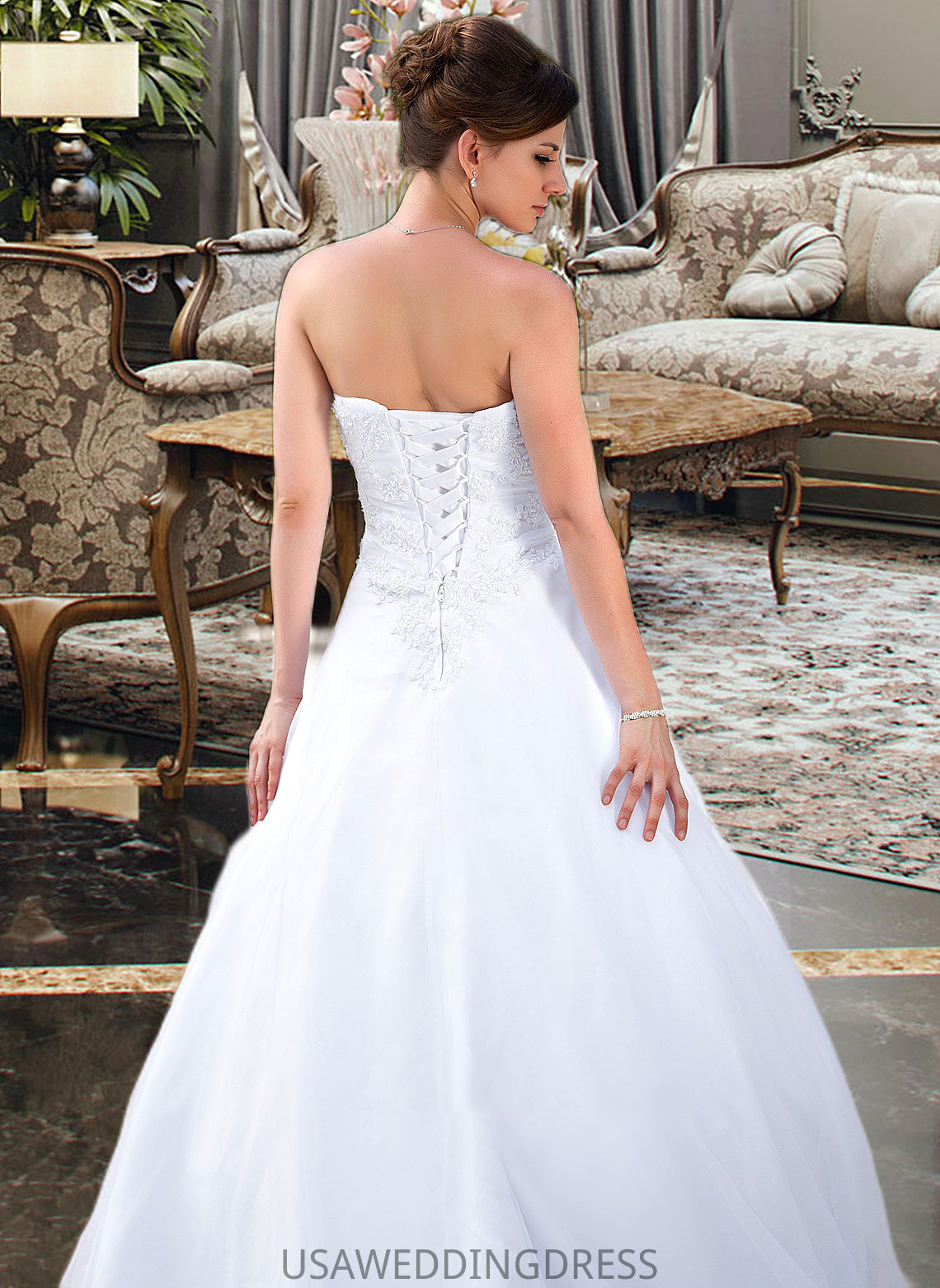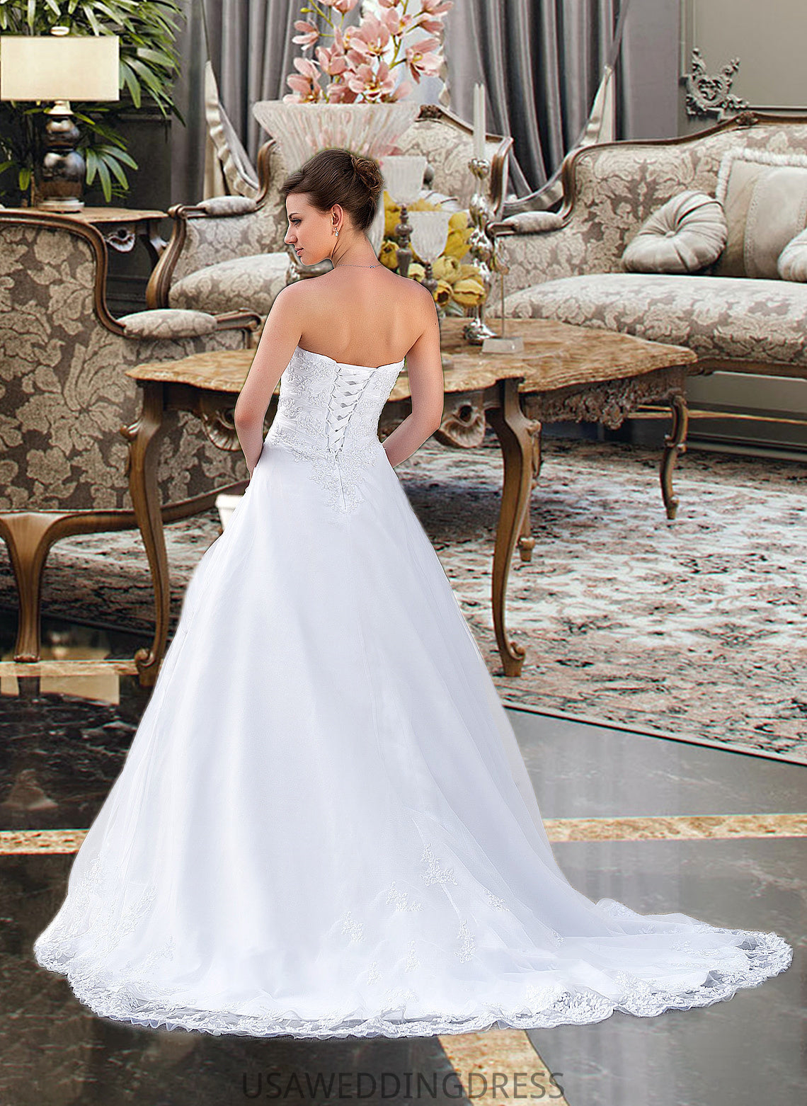 Rosemary Ball-Gown/Princess Strapless Chapel Train Satin Organza Wedding Dress With Lace Beading DSP0013796