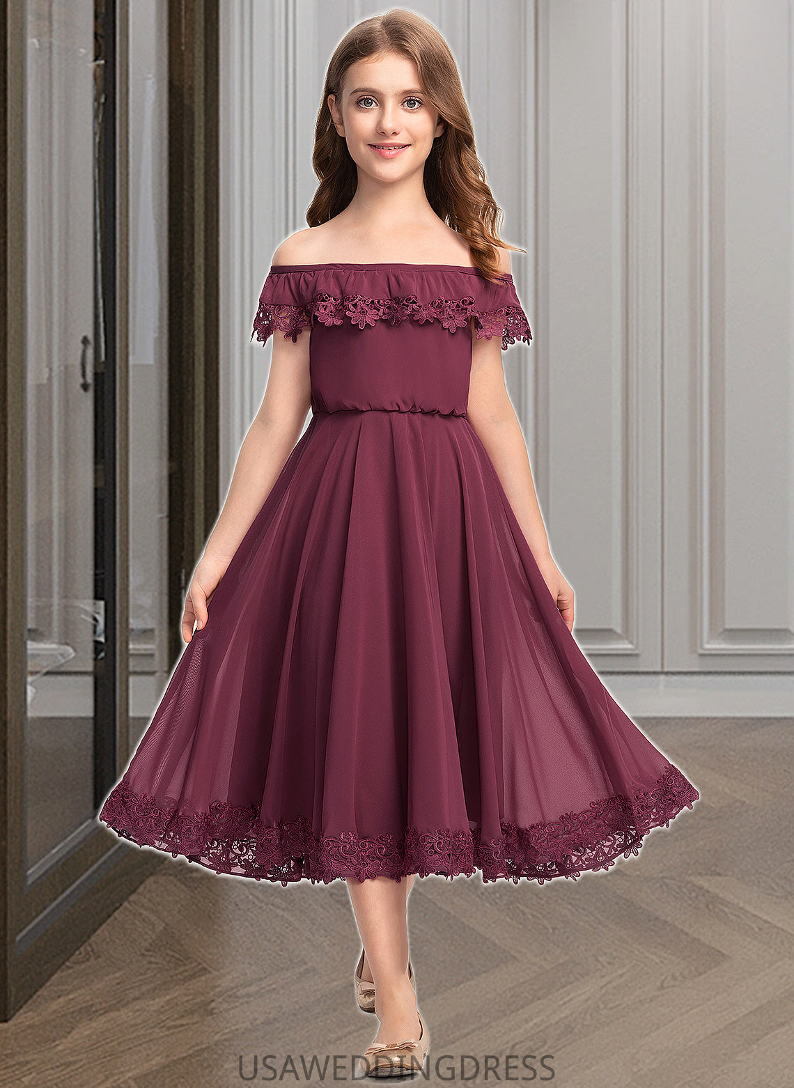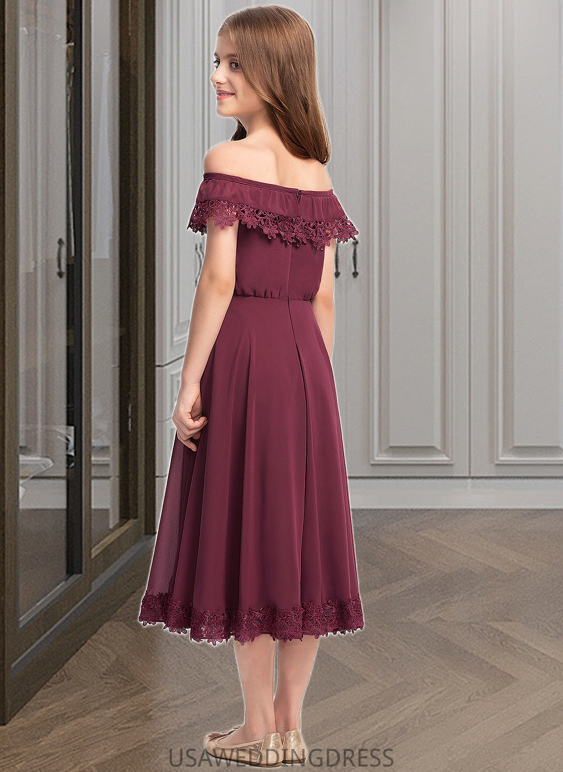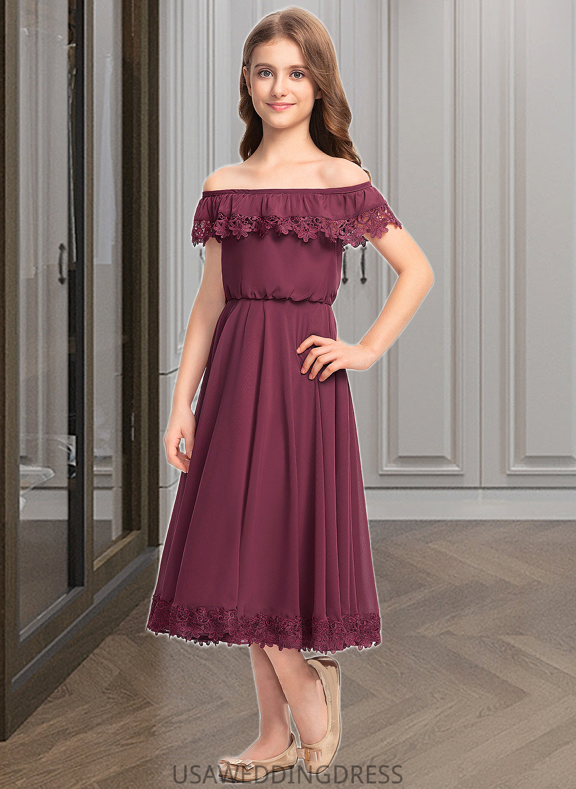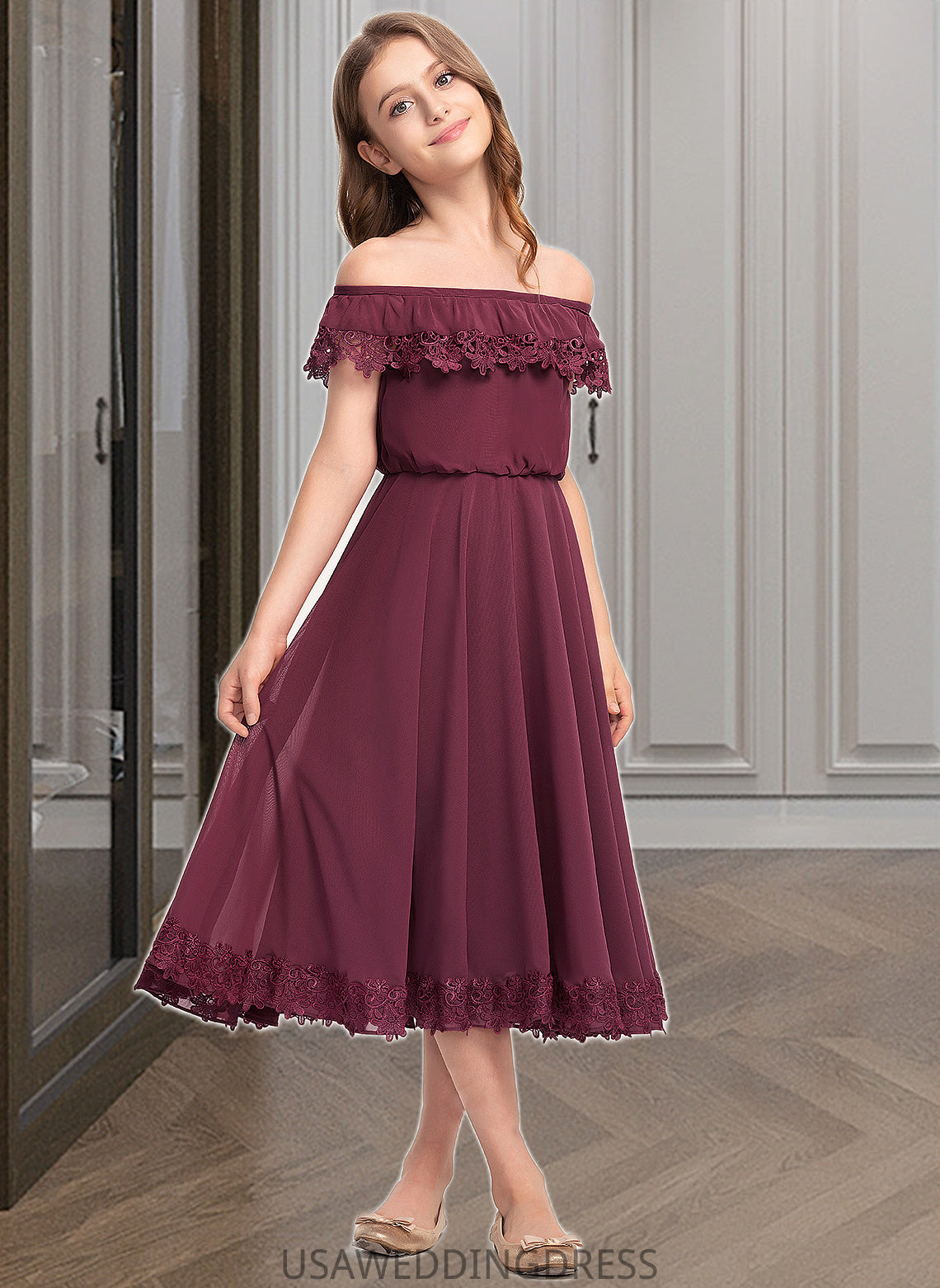 Ruby A-Line Off-the-Shoulder Tea-Length Chiffon Lace Junior Bridesmaid Dress DSP0013505
